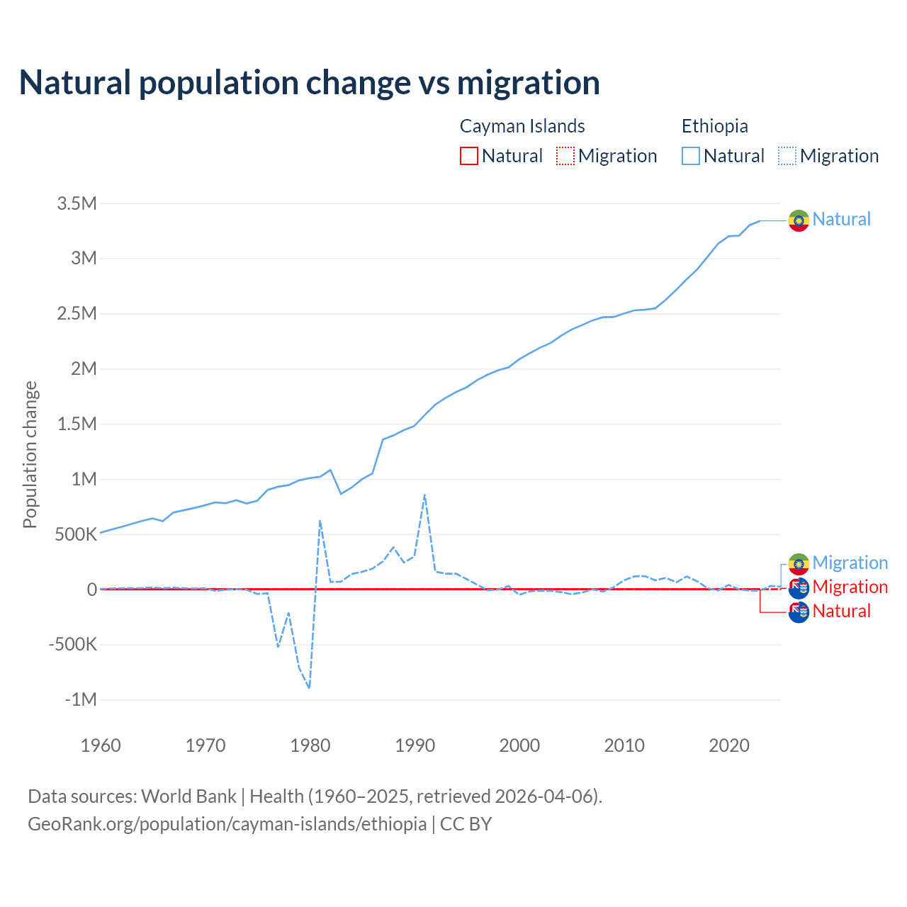 Over the last 10 years, 31.1% of the population change in the Cayman Islands is from natural causes (a gain of 4,468 people) and 68.9% is from migration (a gain of 9,879 people). In Ethiopia 98.8% is from natural causes (a gain of 30,237,373 people) and 1.19% is from migration (a gain of 365,488 people).