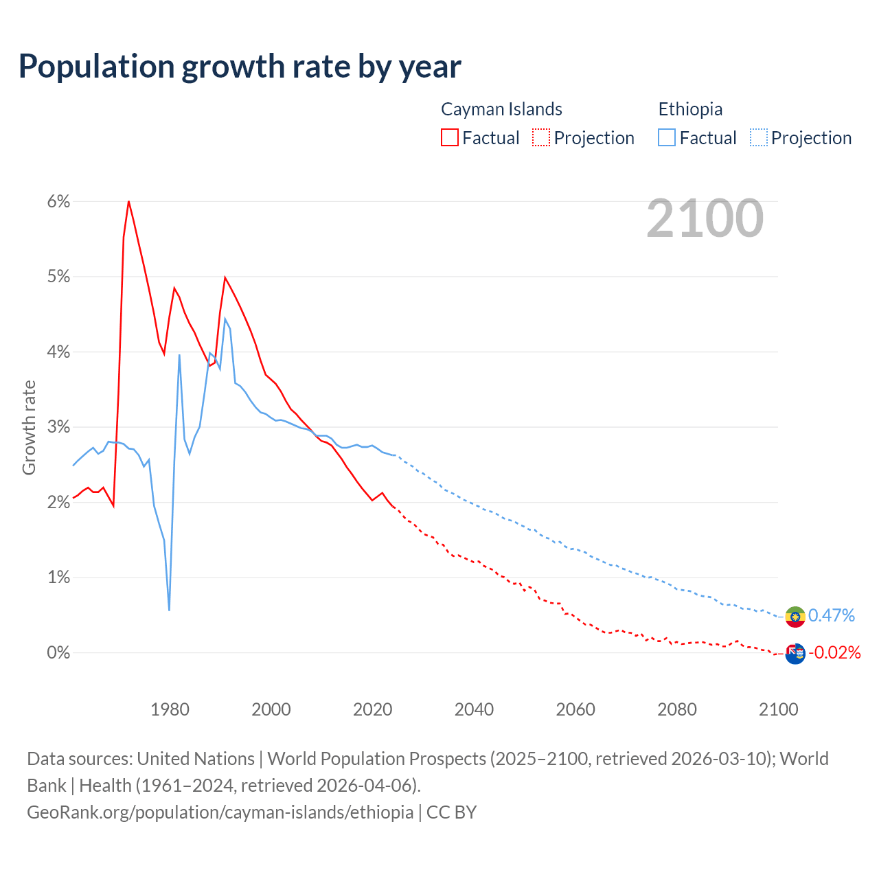 - For the last 10 years, the Cayman Islands has had an average growth rate of +2.19% per year vs +2.71% in Ethiopia.