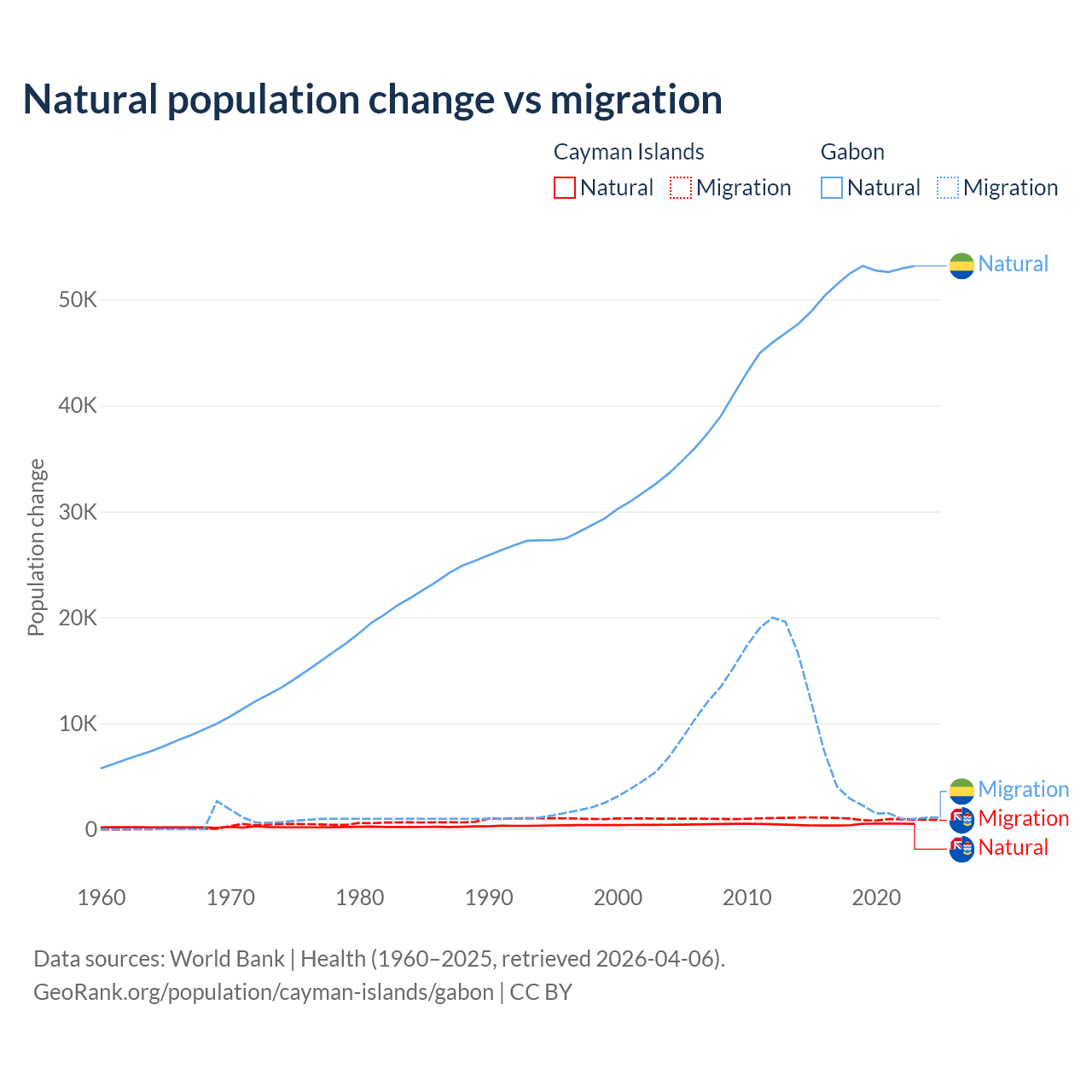 Over the last 10 years, 31.1% of the population change in the Cayman Islands is from natural causes (a gain of 4,468 people) and 68.9% is from migration (a gain of 9,879 people). In Gabon 91.1% is from natural causes (a gain of 515,484 people) and 8.86% is from migration (a gain of 50,119 people).