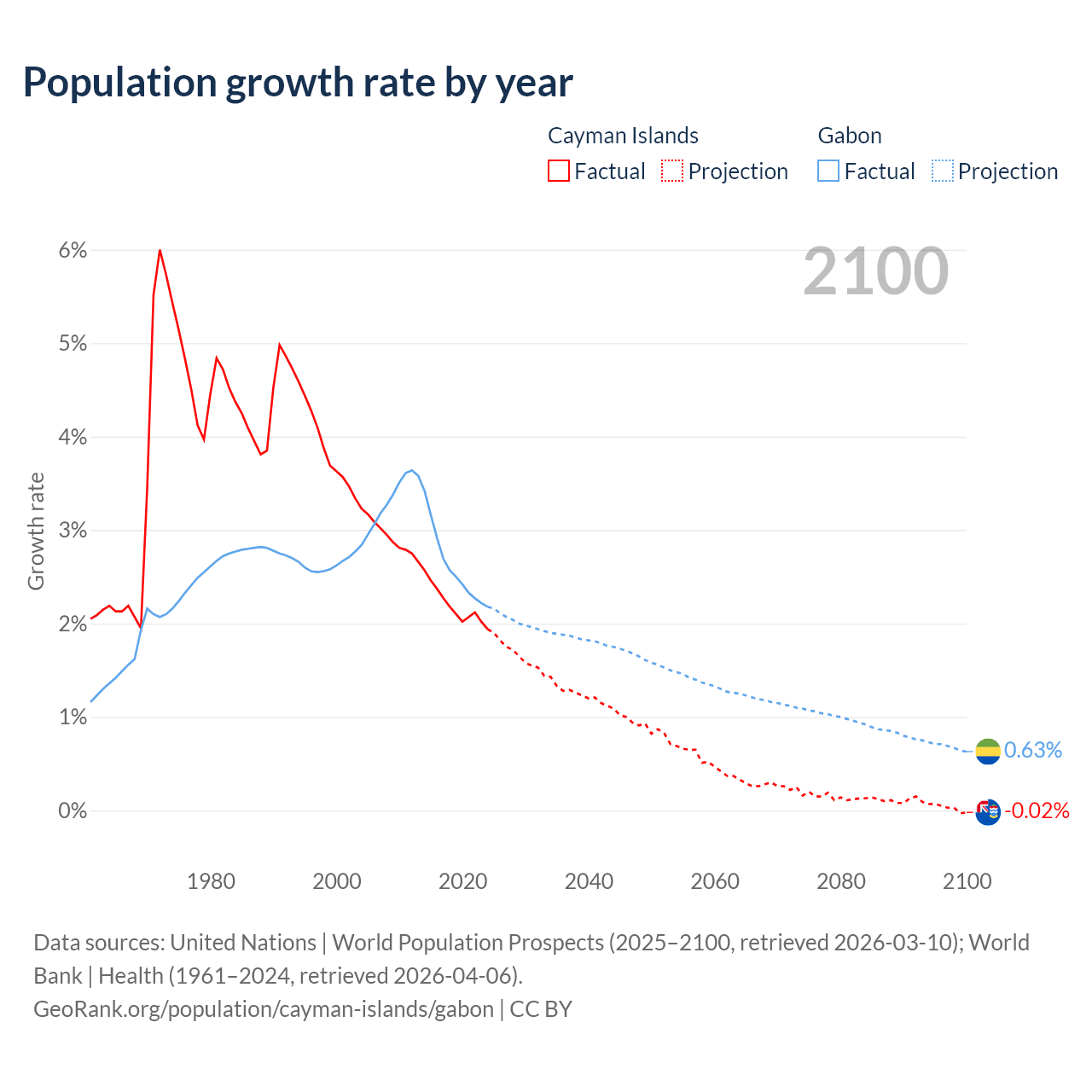 - For the last 10 years, the Cayman Islands has had an average growth rate of +2.19% per year vs +2.61% in Gabon.