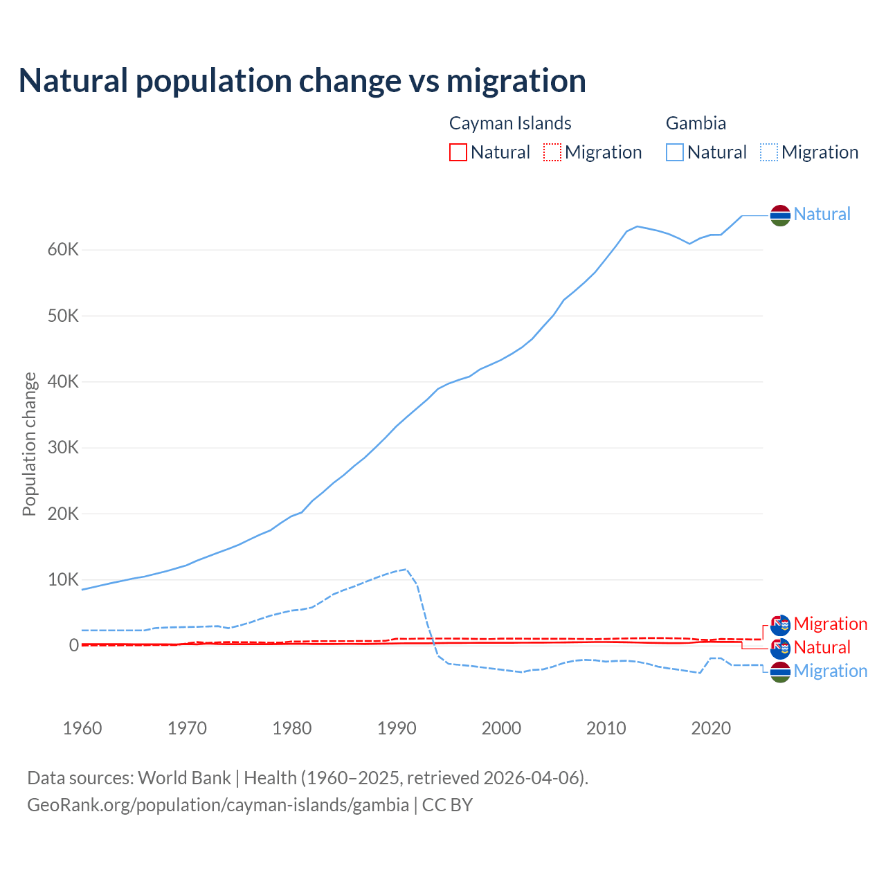 Over the last 10 years, 31.1% of the population change in the Cayman Islands is from natural causes (a gain of 4,468 people) and 68.9% is from migration (a gain of 9,879 people). In the Gambia 95.2% is from natural causes (a gain of 625,795 people) and 4.75% is from migration (a loss of 31,227 people).