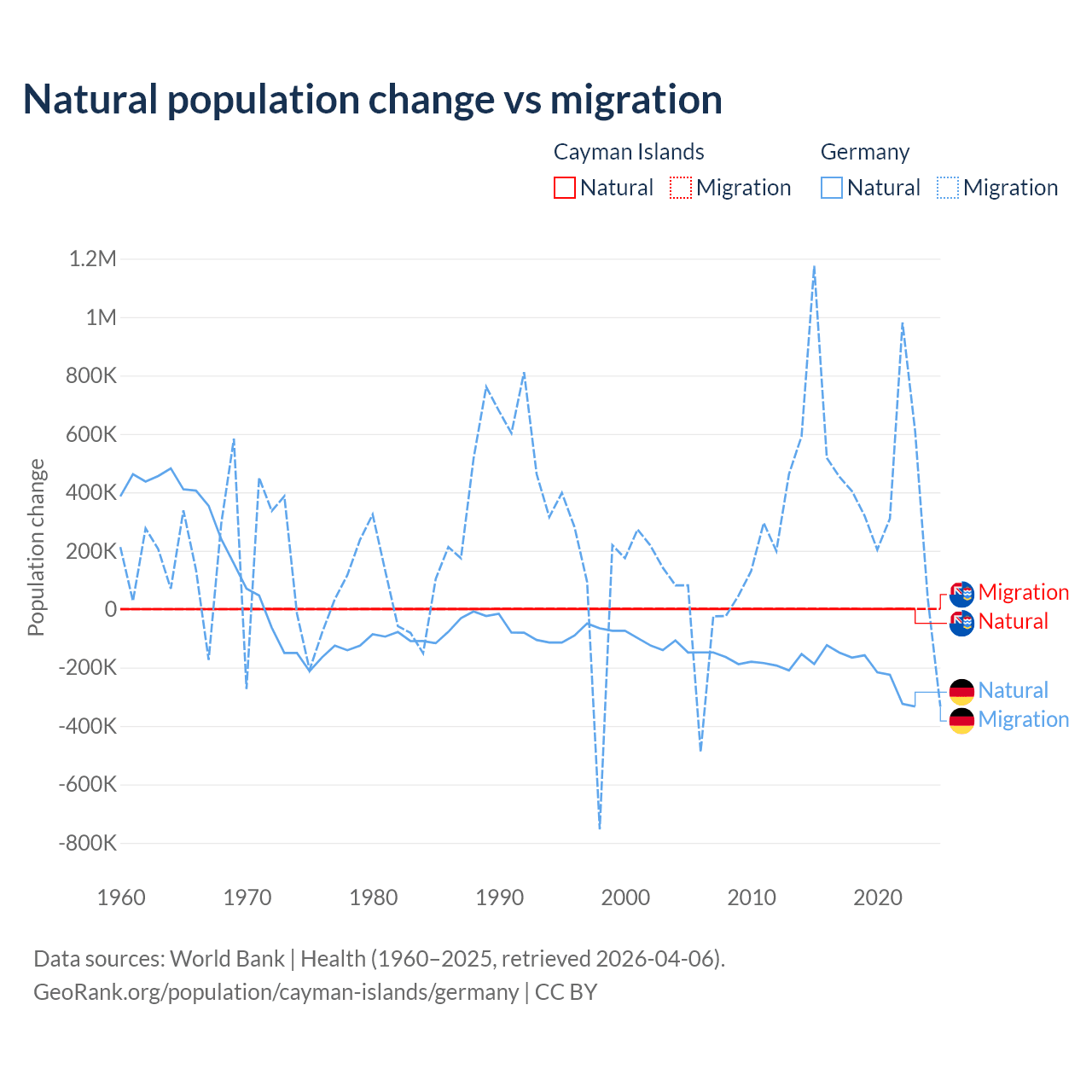 Over the last 10 years, 31.1% of the population change in the Cayman Islands is from natural causes (a gain of 4,468 people) and 68.9% is from migration (a gain of 9,879 people). In Germany 26.8% is from natural causes (a loss of 2,036,130 people) and 73.2% is from migration (a gain of 5,565,916 people).