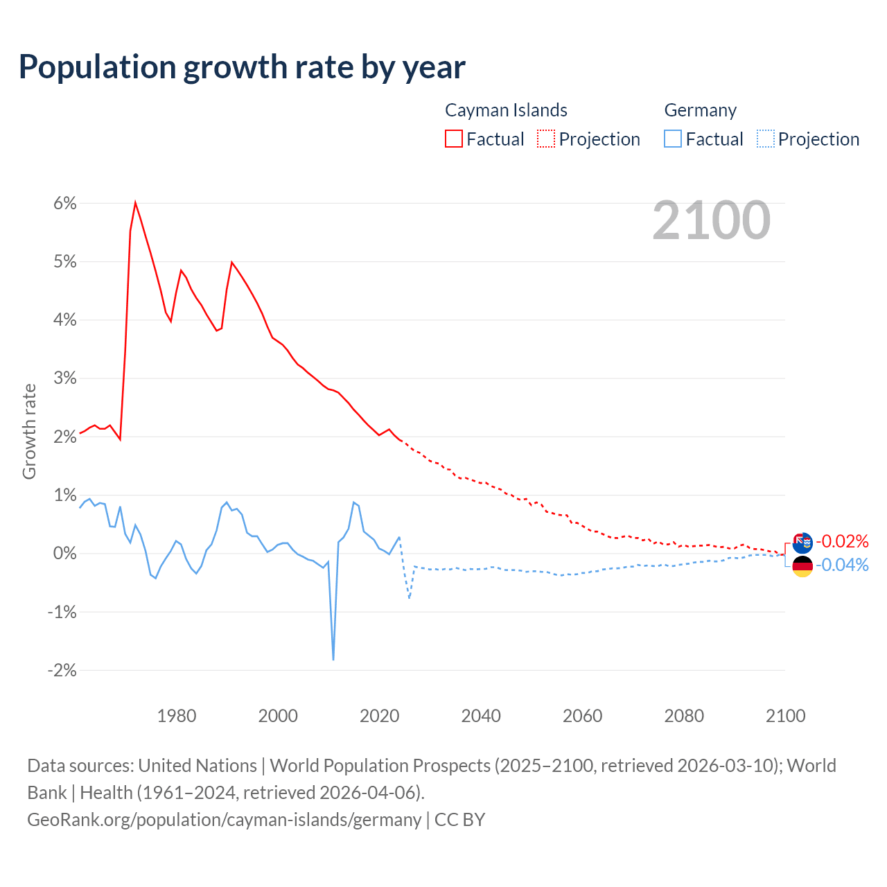 Data sources: World Bank | Health (1960–2024, retrieved 2026-04-06); United Nations | World Population Prospects (1960–2026, retrieved 2026-03-10); U.S. Census Bureau (1960–2025, retrieved 2026-02-08); Central Intelligence Agency (CIA) (2000–2019, retrieved 2026-02-20).