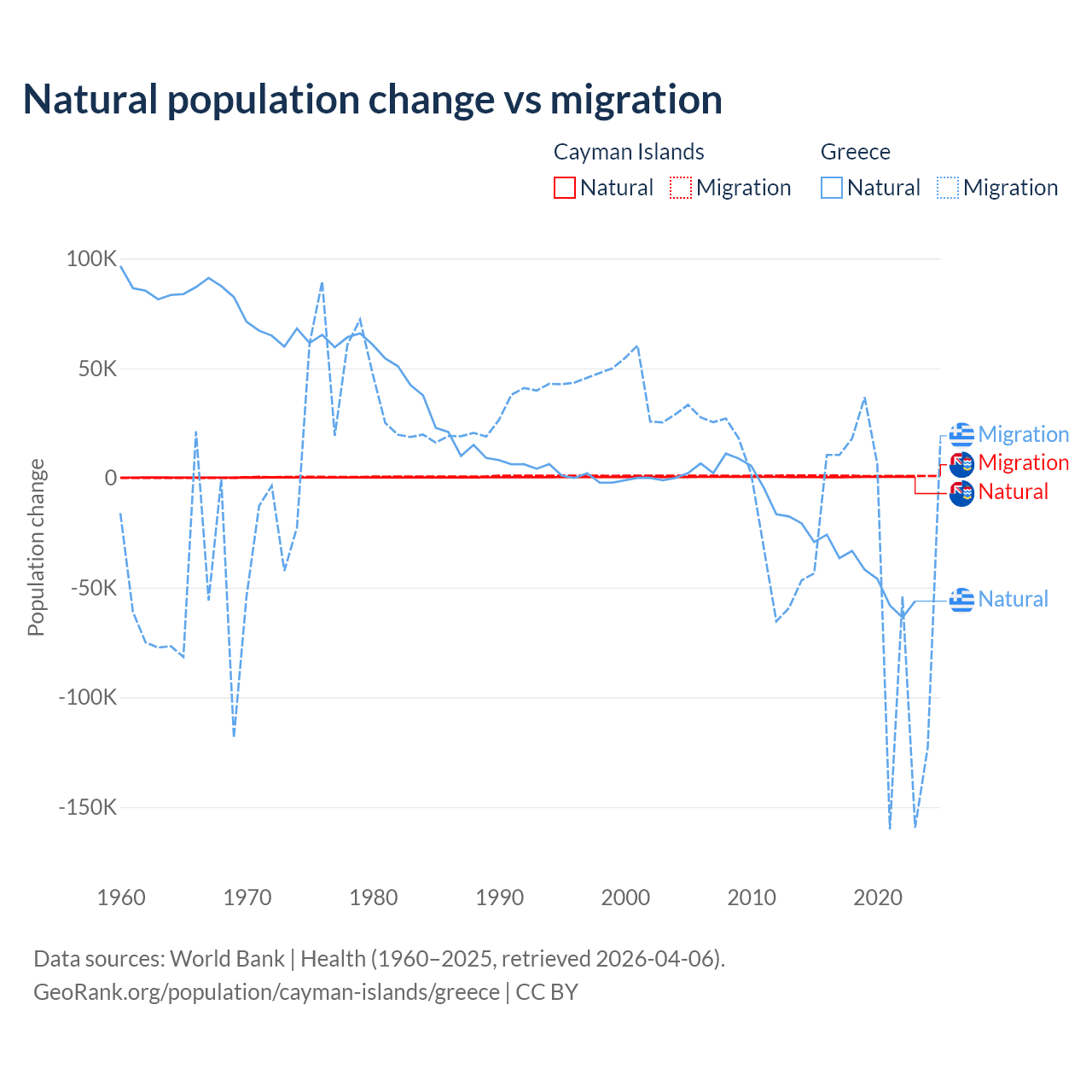 Over the last 10 years, 31.1% of the population change in the Cayman Islands is from natural causes (a gain of 4,468 people) and 68.9% is from migration (a gain of 9,879 people). In Greece 51.9% is from natural causes (a loss of 411,426 people) and 48.1% is from migration (a loss of 381,824 people).
