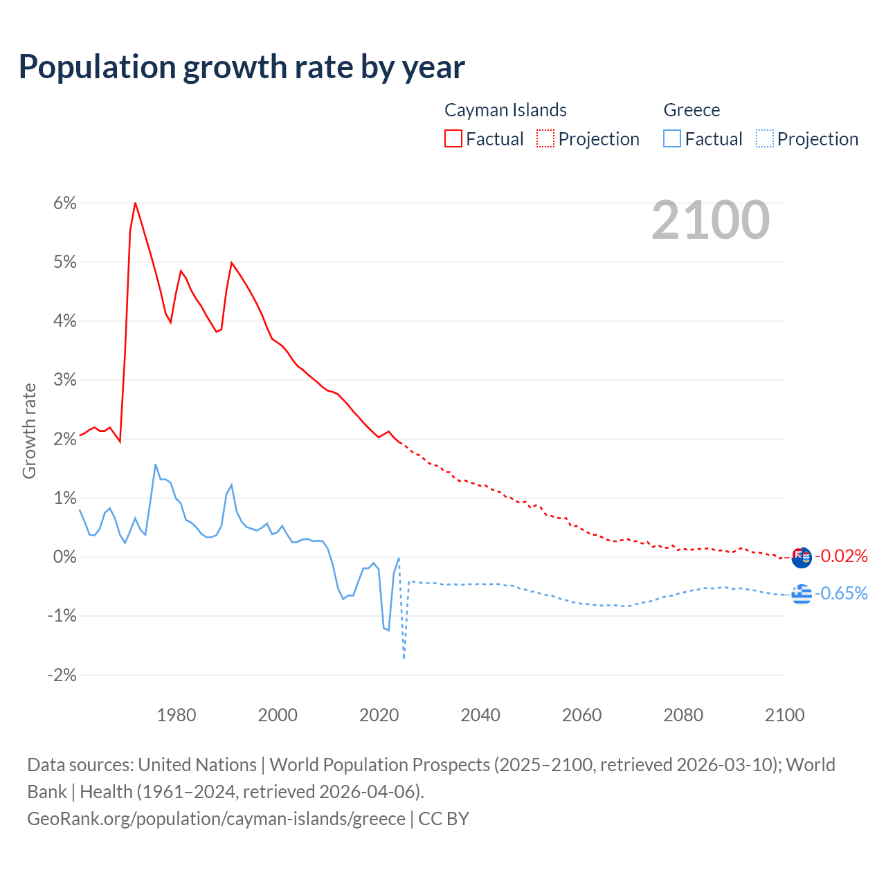 Data sources: World Bank | Health (1960–2024, retrieved 2026-04-06); United Nations | World Population Prospects (1960–2026, retrieved 2026-03-10); U.S. Census Bureau (1960–2025, retrieved 2026-02-08); Central Intelligence Agency (CIA) (2000–2019, retrieved 2026-02-20).