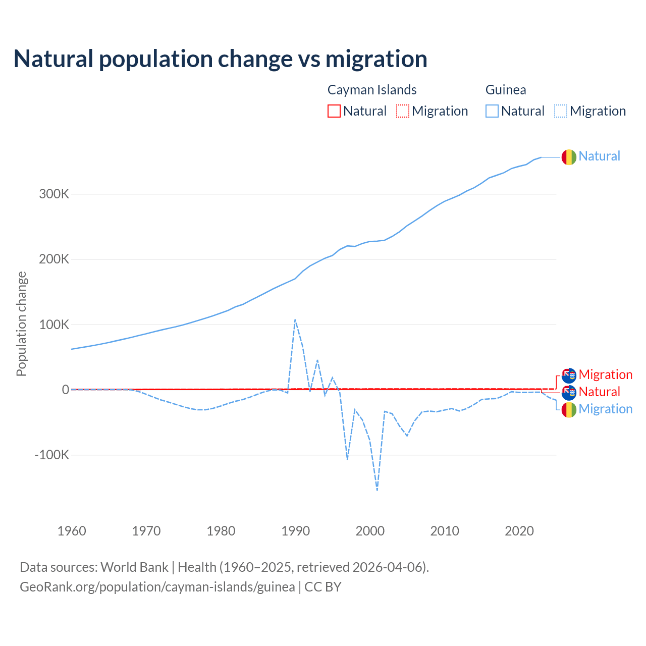 Over the last 10 years, 31.1% of the population change in the Cayman Islands is from natural causes (a gain of 4,468 people) and 68.9% is from migration (a gain of 9,879 people). In Guinea 97.2% is from natural causes (a gain of 3,346,936 people) and 2.76% is from migration (a loss of 94,924 people).