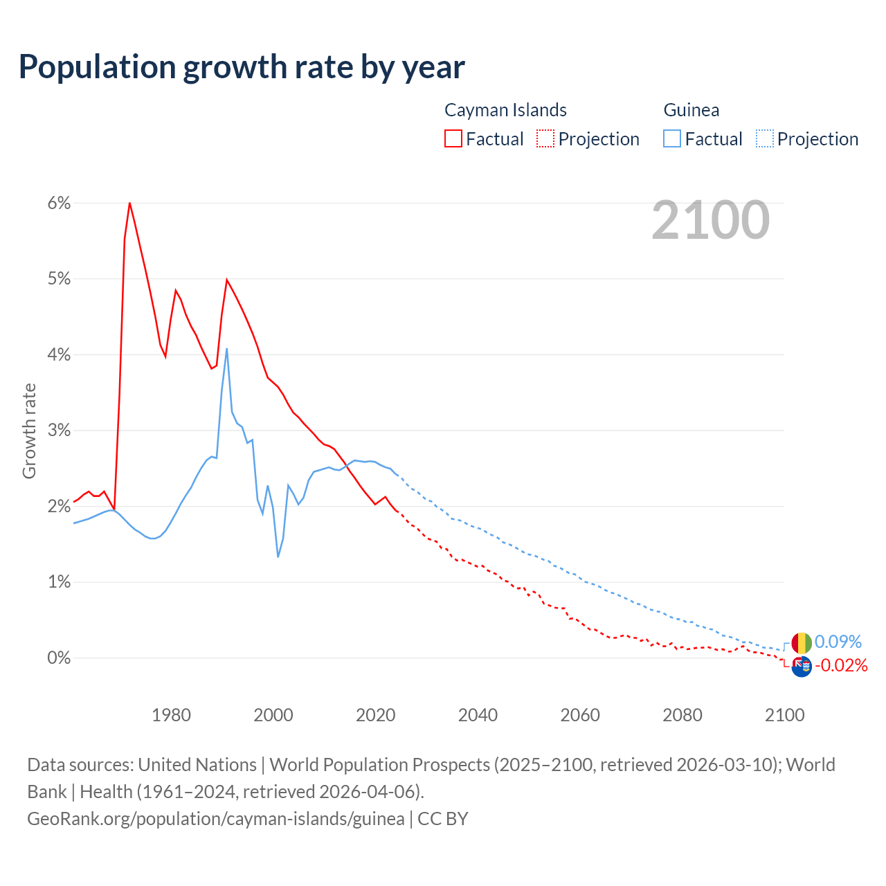 - For the last 10 years, the Cayman Islands has had an average growth rate of +2.19% per year vs +2.54% in Guinea.