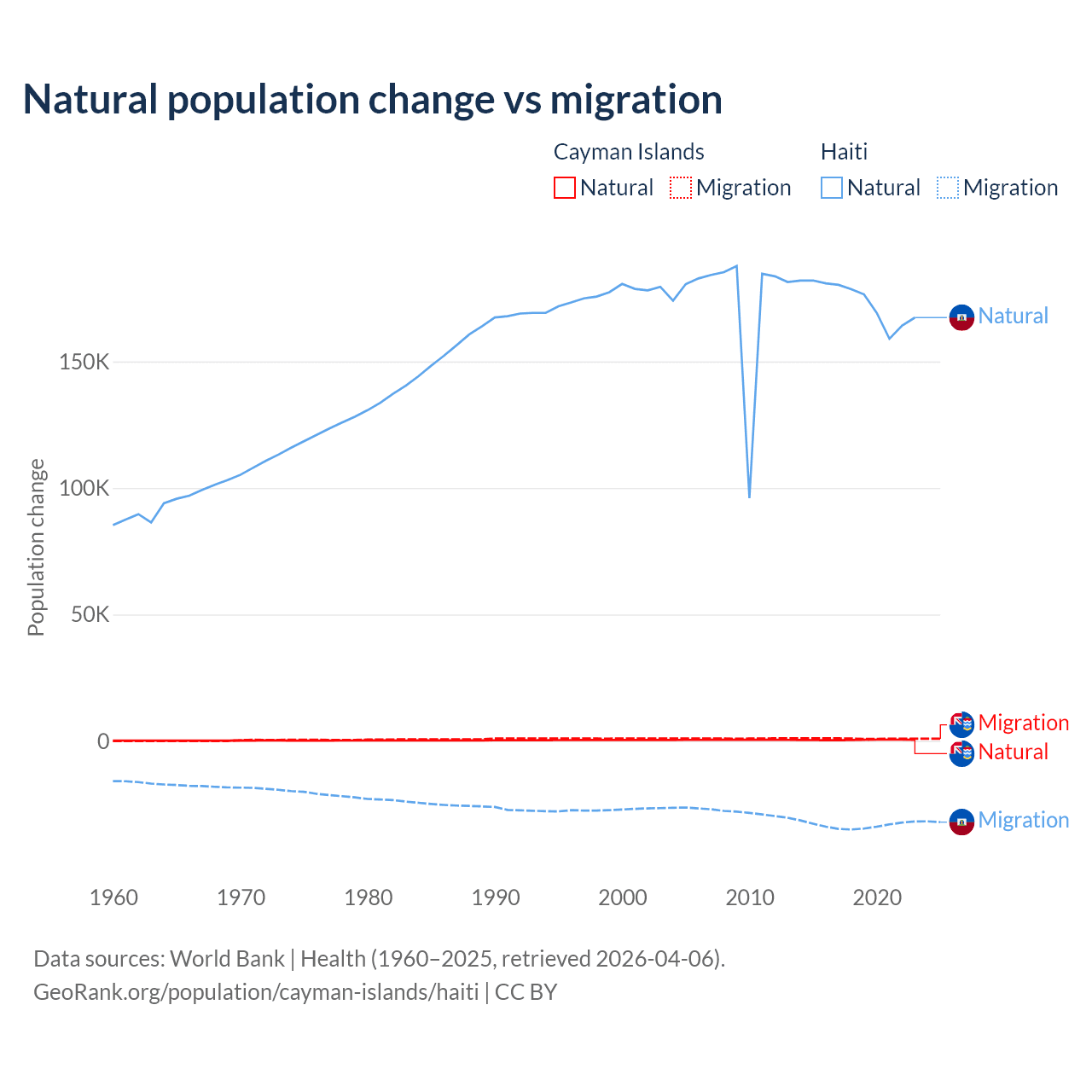 Over the last 10 years, 31.1% of the population change in the Cayman Islands is from natural causes (a gain of 4,468 people) and 68.9% is from migration (a gain of 9,879 people). In Haiti 83.9% is from natural causes (a gain of 1,740,319 people) and 16.1% is from migration (a loss of 333,076 people).