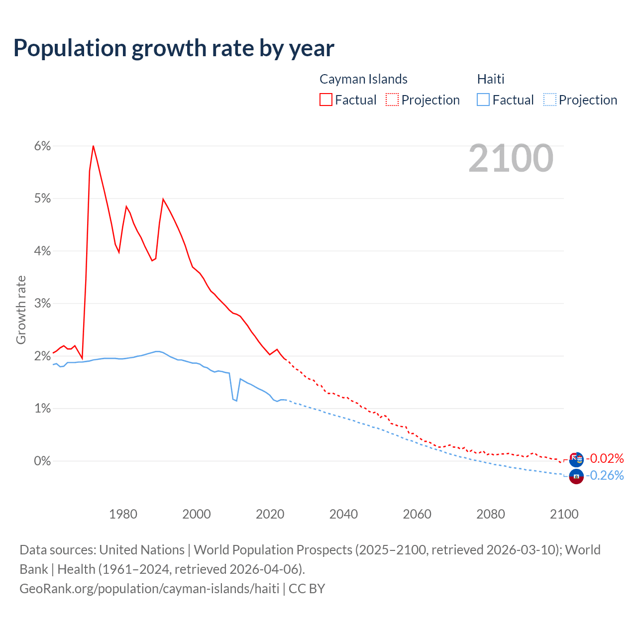 Data sources: World Bank | Health (1960–2024, retrieved 2026-04-06); United Nations | World Population Prospects (1960–2026, retrieved 2026-03-10); U.S. Census Bureau (1960–2025, retrieved 2026-02-08); Central Intelligence Agency (CIA) (2000–2019, retrieved 2026-02-20).