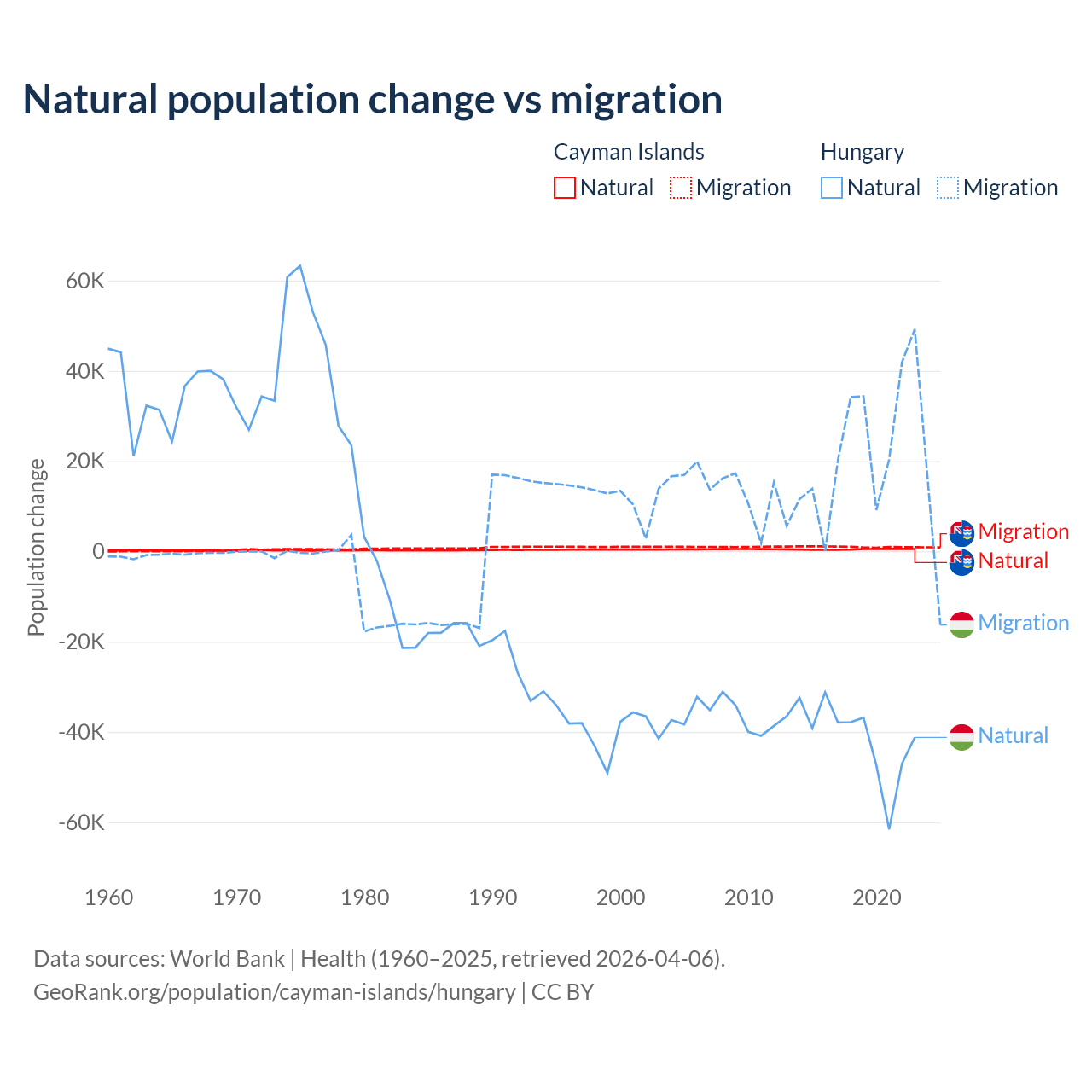 Over the last 10 years, 31.1% of the population change in the Cayman Islands is from natural causes (a gain of 4,468 people) and 68.9% is from migration (a gain of 9,879 people). In Hungary 63.7% is from natural causes (a loss of 412,838 people) and 36.3% is from migration (a gain of 234,837 people).