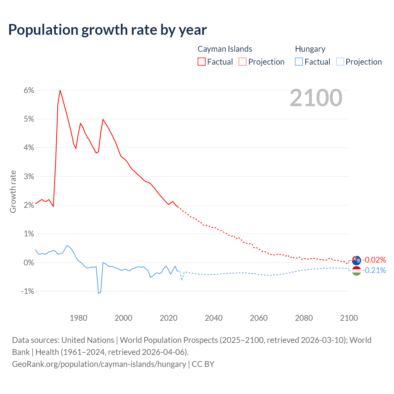 - For the last 10 years, the Cayman Islands has had an average growth rate of +2.19% per year vs -0.29% in Hungary.