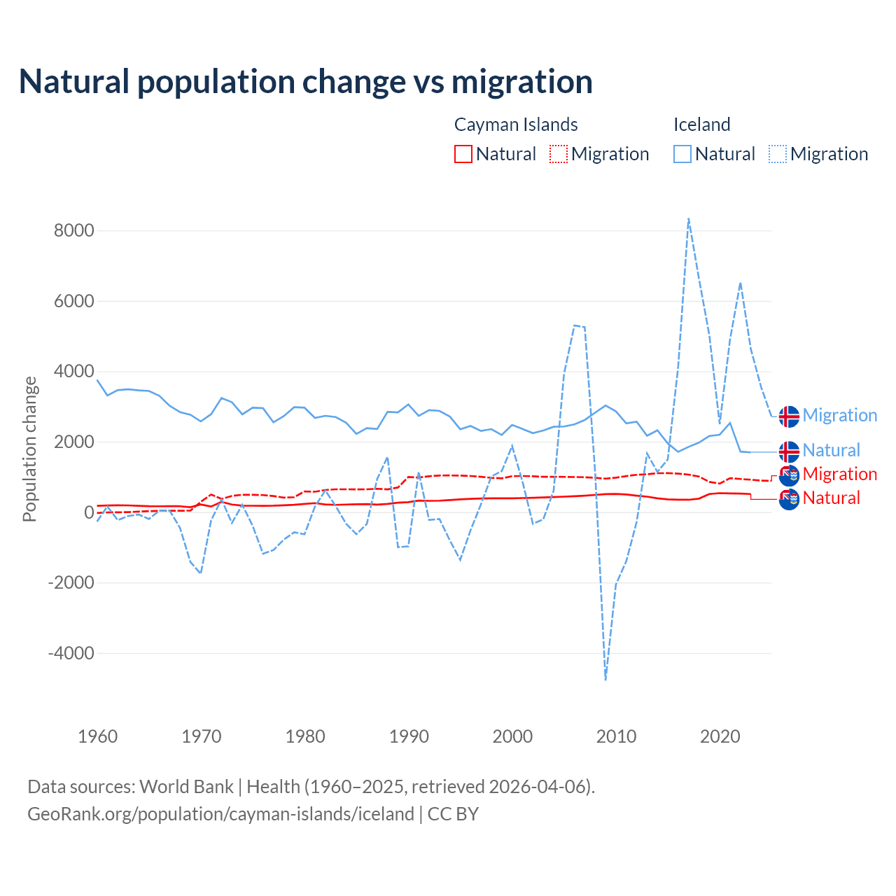 Over the last 10 years, 31.1% of the population change in the Cayman Islands is from natural causes (a gain of 4,468 people) and 68.9% is from migration (a gain of 9,879 people). In Iceland 30.7% is from natural causes (a gain of 20,128 people) and 69.3% is from migration (a gain of 45,356 people).