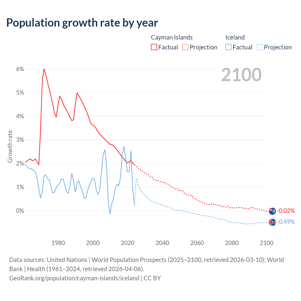 - For the last 10 years, the Cayman Islands has had an average growth rate of +2.19% per year vs +1.63% in Iceland.