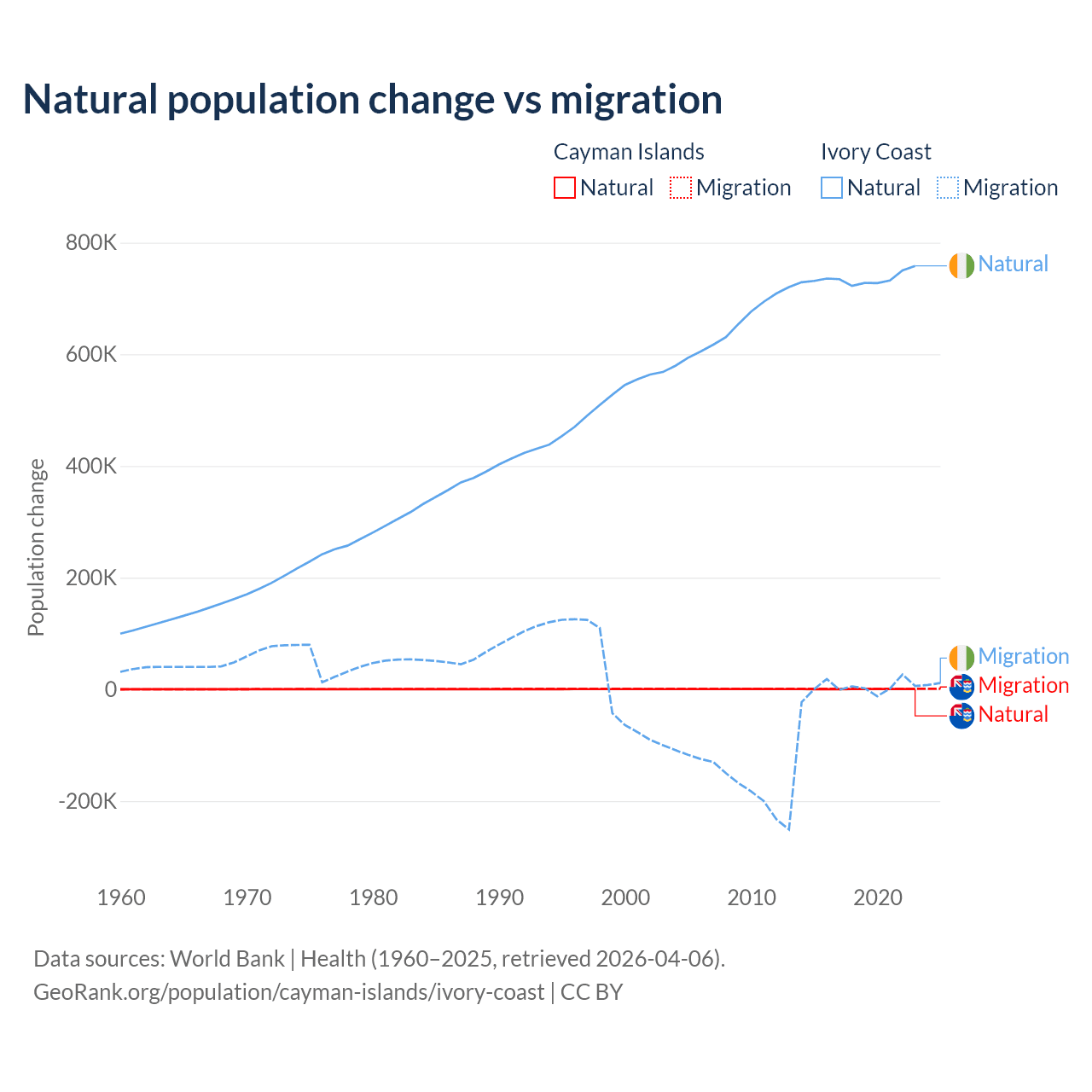 Over the last 10 years, 31.1% of the population change in the Cayman Islands is from natural causes (a gain of 4,468 people) and 68.9% is from migration (a gain of 9,879 people). In Ivory Coast 99.7% is from natural causes (a gain of 7,348,944 people) and 0.33% is from migration (a gain of 24,432 people).