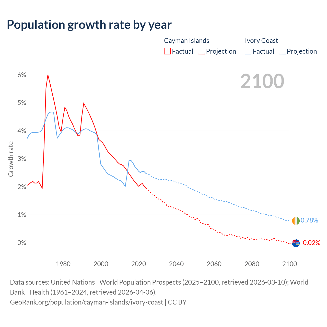 - For the last 10 years, the Cayman Islands has had an average growth rate of +2.19% per year vs +2.65% in Ivory Coast.