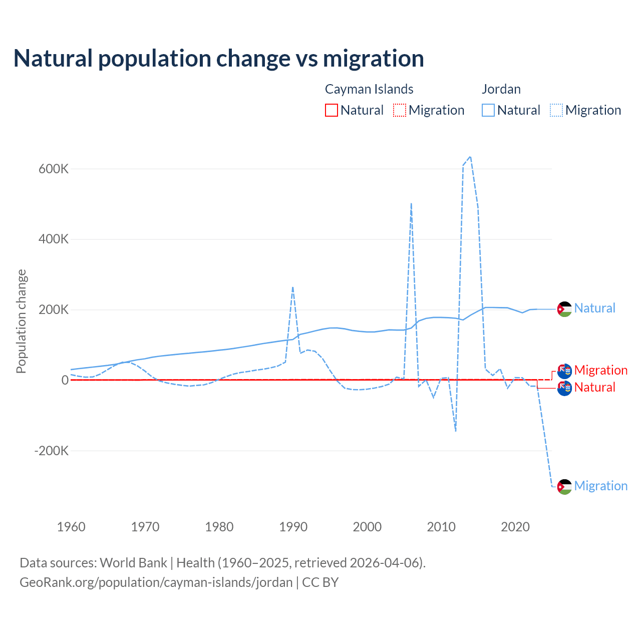 Over the last 10 years, 31.1% of the population change in the Cayman Islands is from natural causes (a gain of 4,468 people) and 68.9% is from migration (a gain of 9,879 people). In Jordan 63.2% is from natural causes (a gain of 1,991,452 people) and 36.8% is from migration (a gain of 1,157,625 people).
