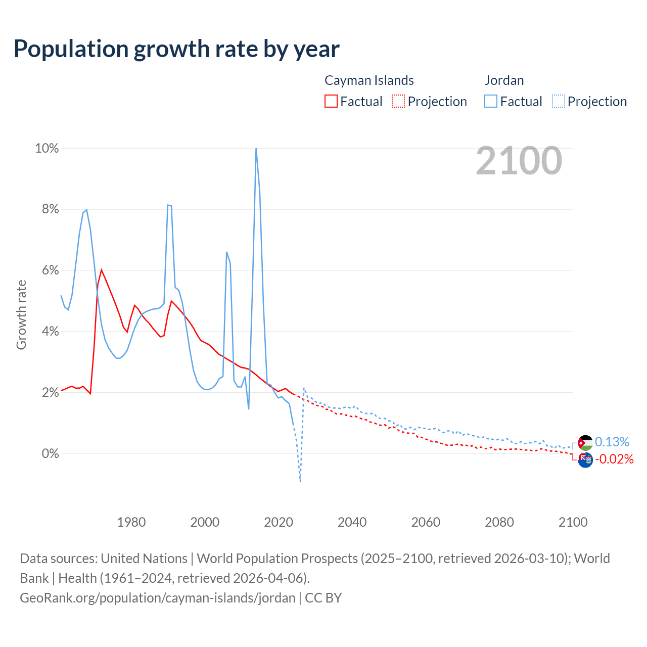 - For the last 10 years, the Cayman Islands has had an average growth rate of +2.19% per year vs +3.45% in Jordan.