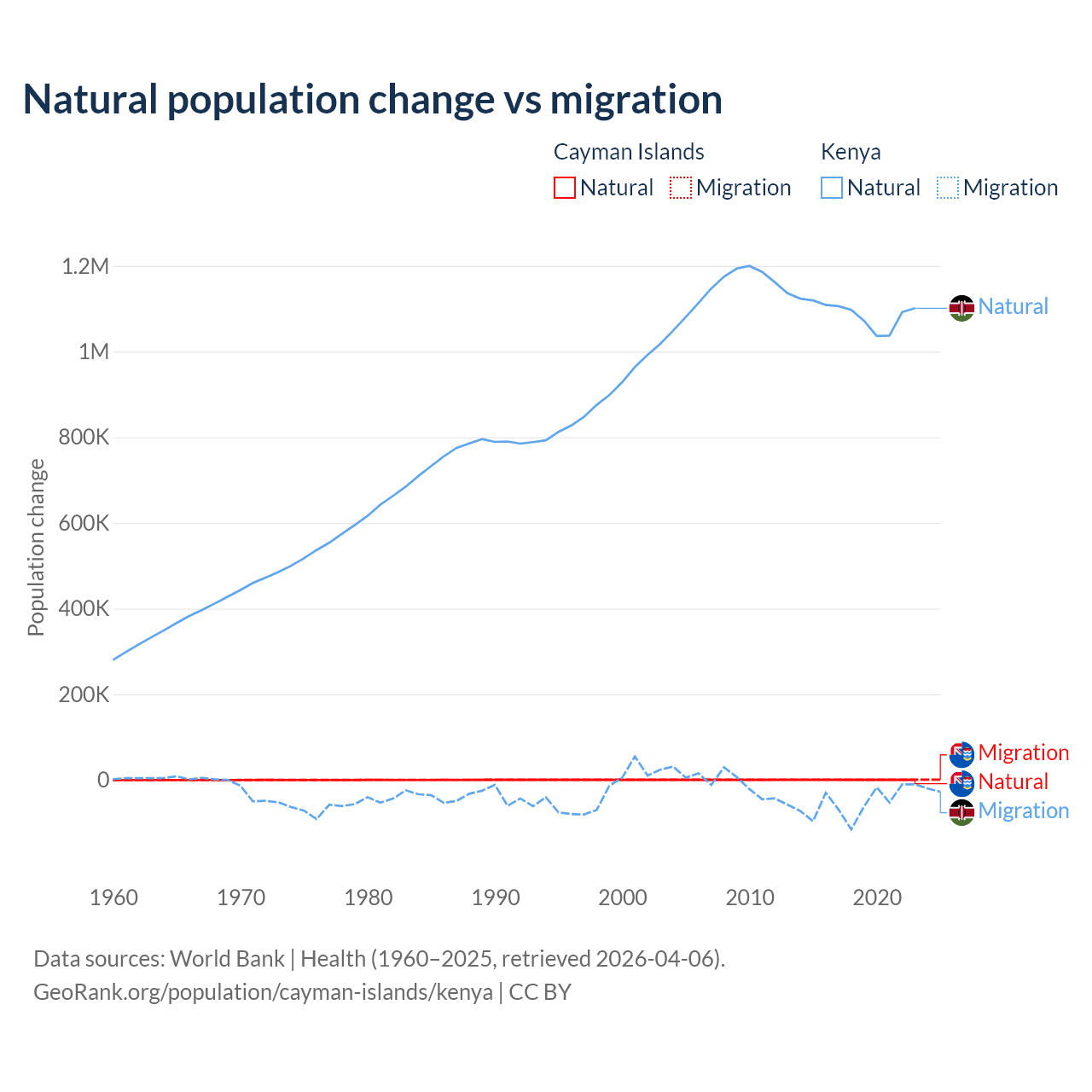 Over the last 10 years, 31.1% of the population change in the Cayman Islands is from natural causes (a gain of 4,468 people) and 68.9% is from migration (a gain of 9,879 people). In Kenya 95.3% is from natural causes (a gain of 10,892,362 people) and 4.67% is from migration (a loss of 533,876 people).