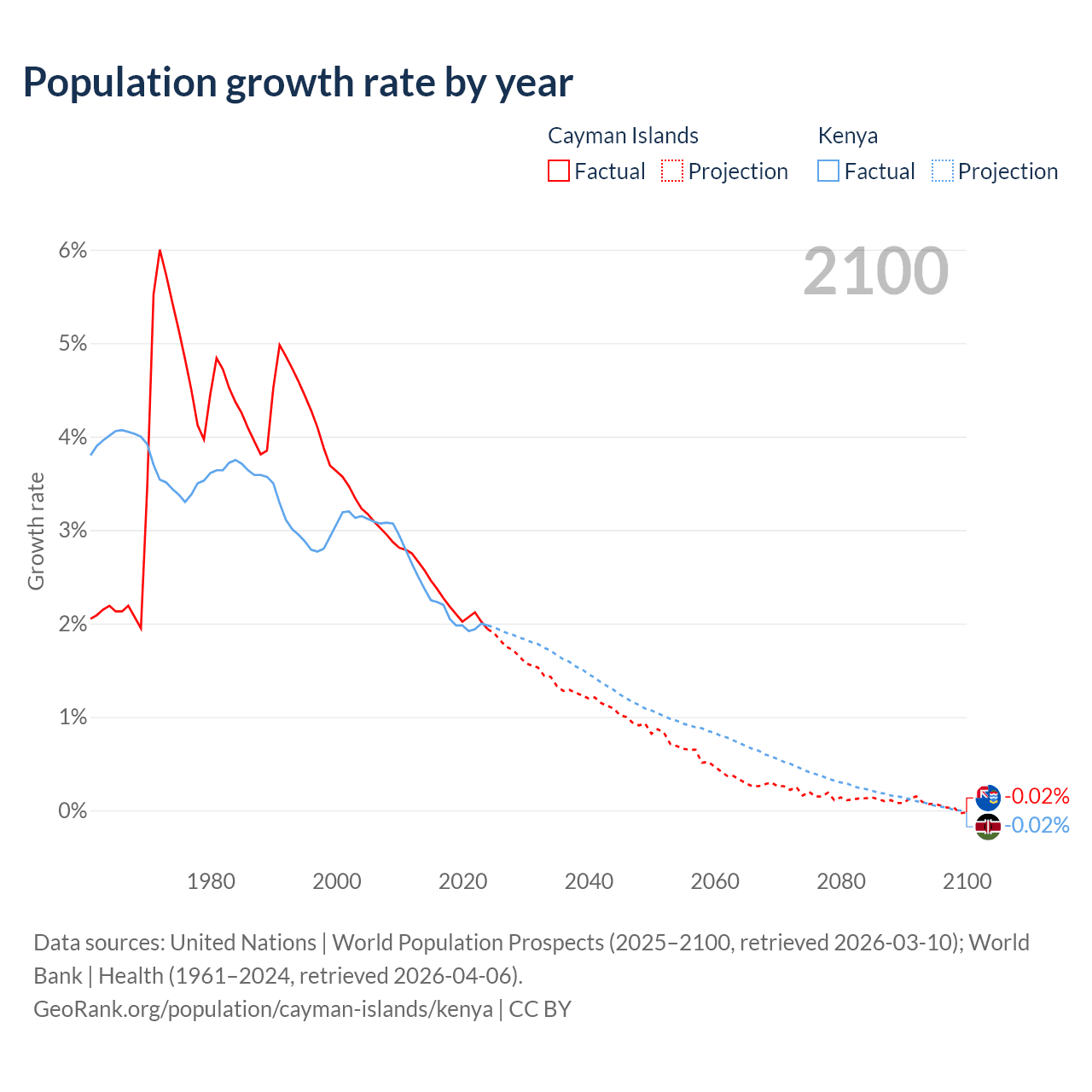 - For the last 10 years, the Cayman Islands has had an average growth rate of +2.19% per year vs +2.08% in Kenya.