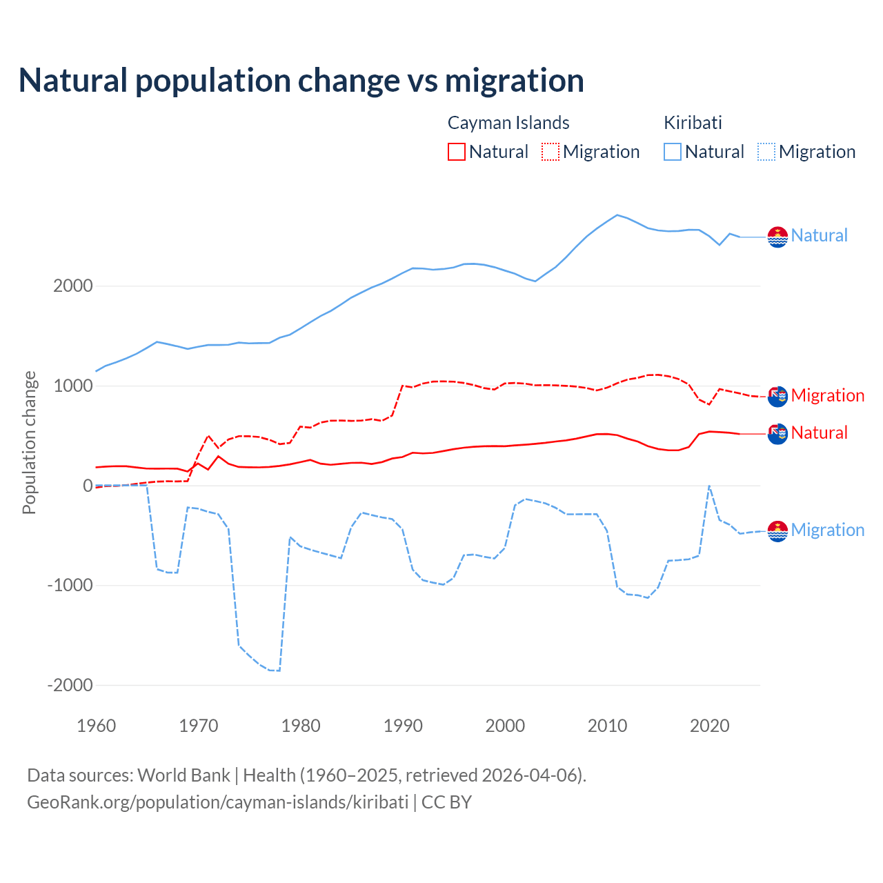Over the last 10 years, 31.1% of the population change in the Cayman Islands is from natural causes (a gain of 4,468 people) and 68.9% is from migration (a gain of 9,879 people). In Kiribati 80% is from natural causes (a gain of 25,262 people) and 20% is from migration (a loss of 6,330 people).