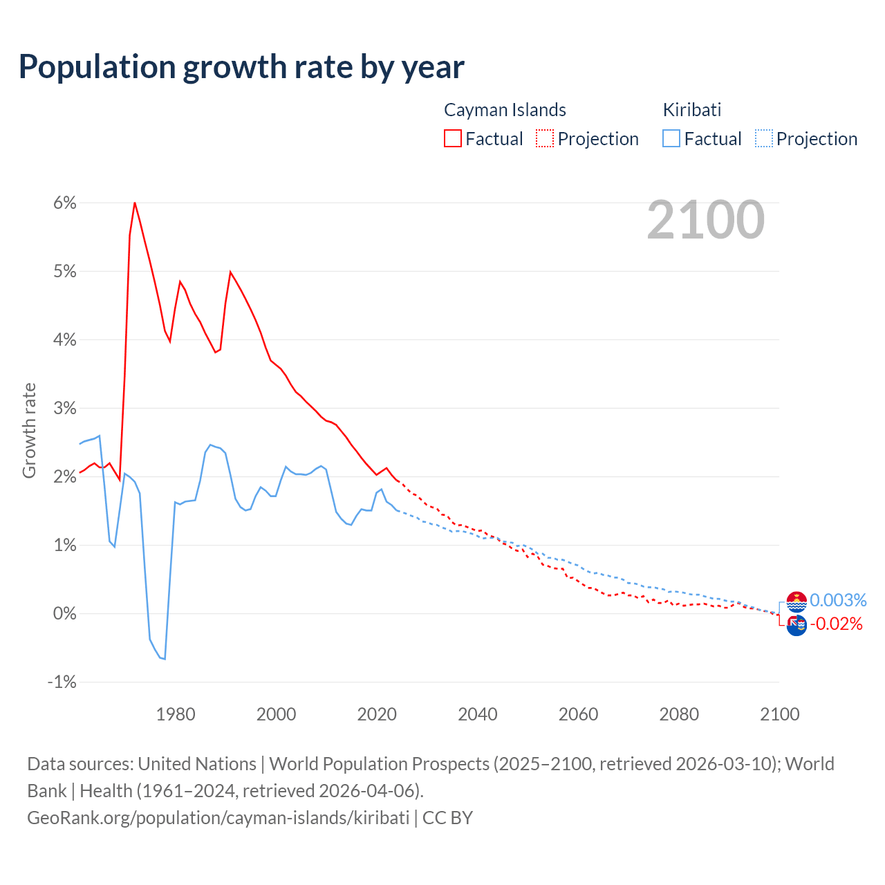 - For the last 10 years, the Cayman Islands has had an average growth rate of +2.19% per year vs +1.53% in Kiribati.