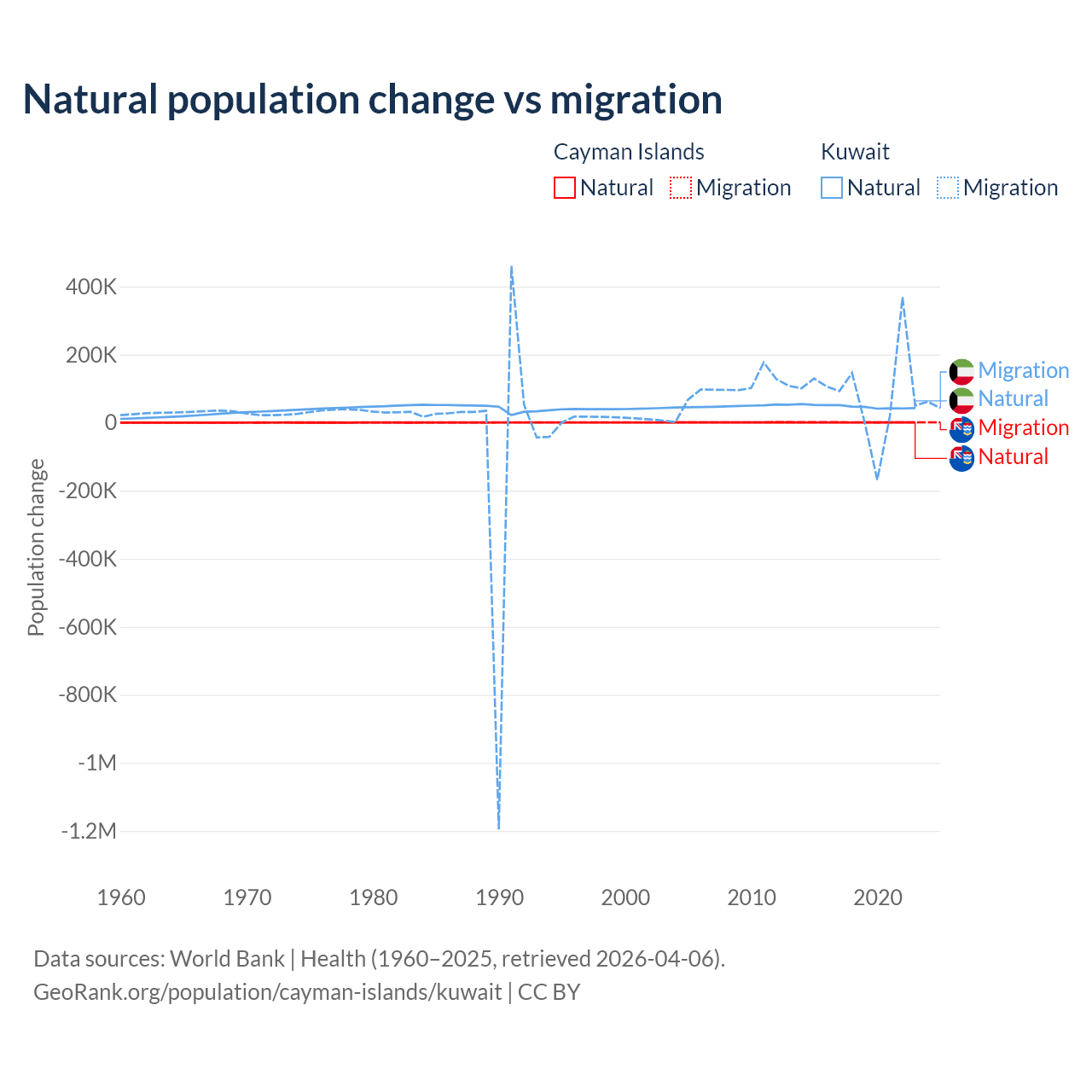 Over the last 10 years, 31.1% of the population change in the Cayman Islands is from natural causes (a gain of 4,468 people) and 68.9% is from migration (a gain of 9,879 people). In Kuwait 35.8% is from natural causes (a gain of 470,645 people) and 64.2% is from migration (a gain of 845,142 people).