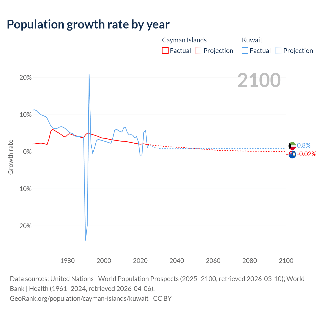 - For the last 10 years, the Cayman Islands has had an average growth rate of +2.19% per year vs +3.1% in Kuwait.