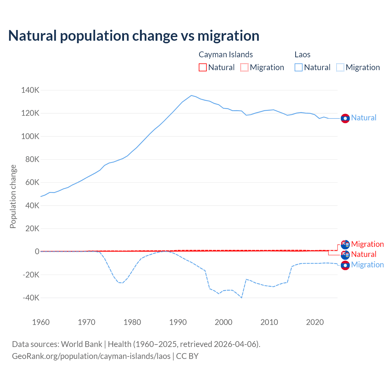 Over the last 10 years, 31.1% of the population change in the Cayman Islands is from natural causes (a gain of 4,468 people) and 68.9% is from migration (a gain of 9,879 people). In Laos 90.6% is from natural causes (a gain of 1,183,013 people) and 9.41% is from migration (a loss of 122,899 people).