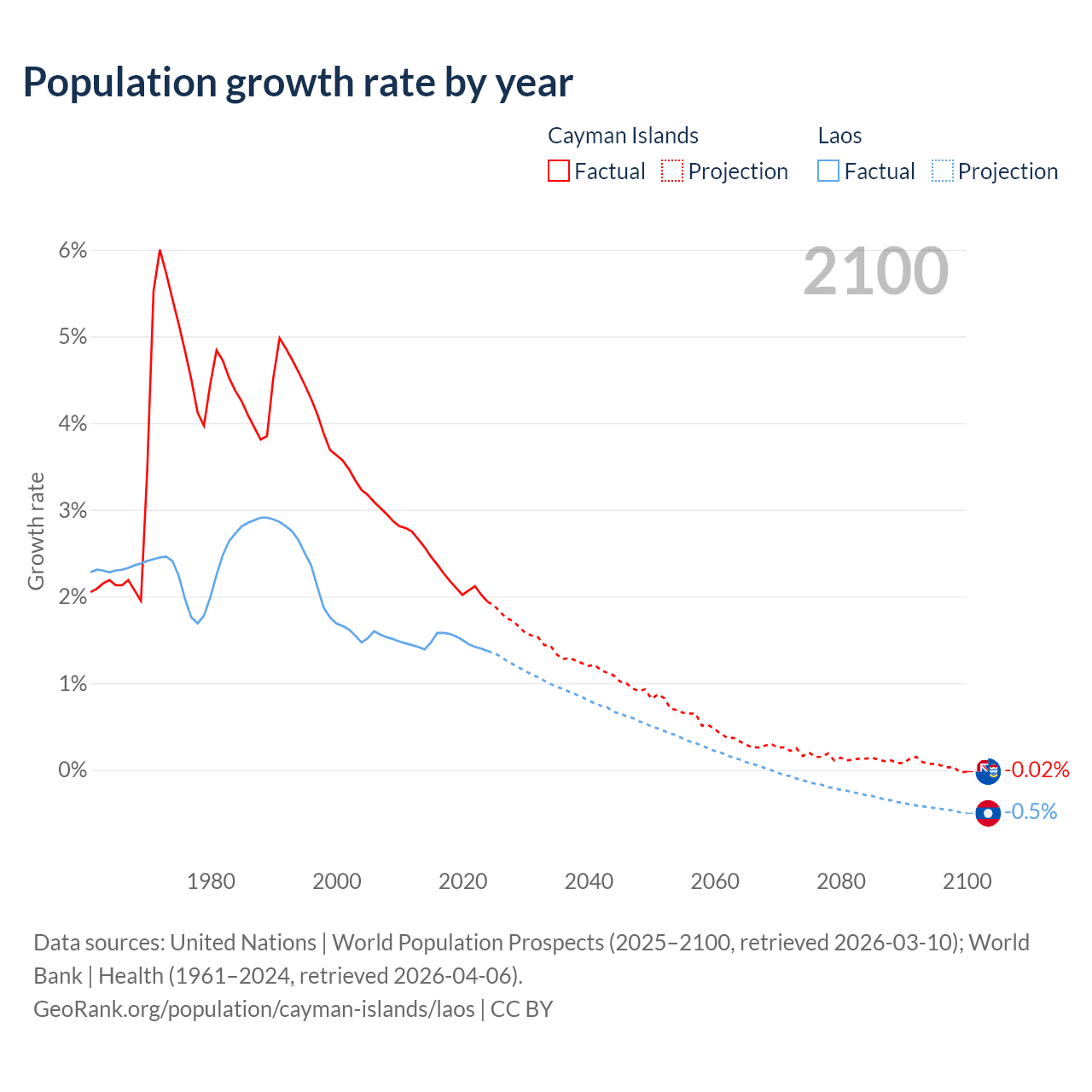 - For the last 10 years, the Cayman Islands has had an average growth rate of +2.19% per year vs +1.48% in Laos.