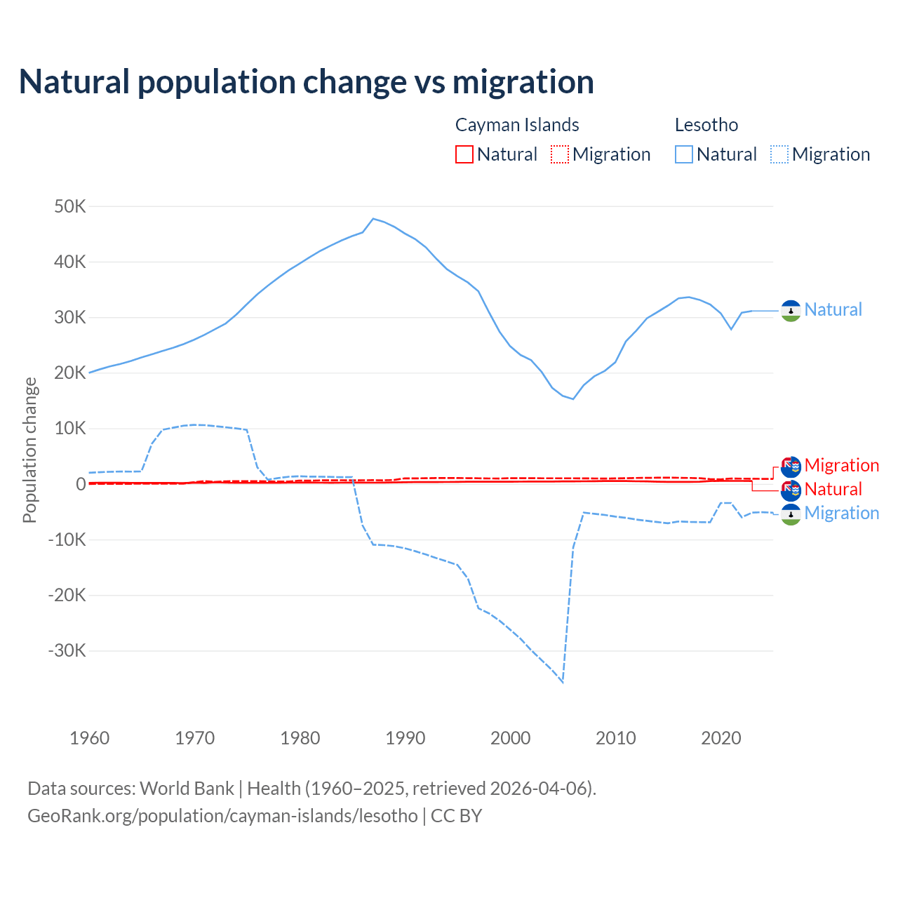 Over the last 10 years, 31.1% of the population change in the Cayman Islands is from natural causes (a gain of 4,468 people) and 68.9% is from migration (a gain of 9,879 people). In Lesotho 84.2% is from natural causes (a gain of 315,836 people) and 15.8% is from migration (a loss of 59,457 people).