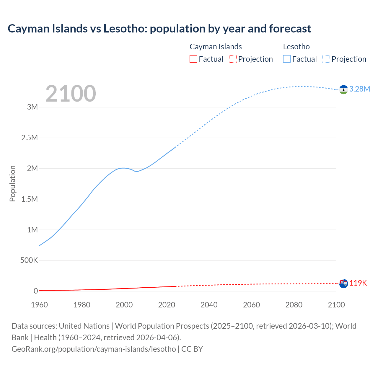 The latest officially reported population of the Cayman Islands was 74,457 in 2024 vs 2,337,423 people in Lesotho in 2024. In 2026, based on the adjusted UN estimation, the current Cayman Islands' population is 77,619 people compared to 2,396,633 in Lesotho.
