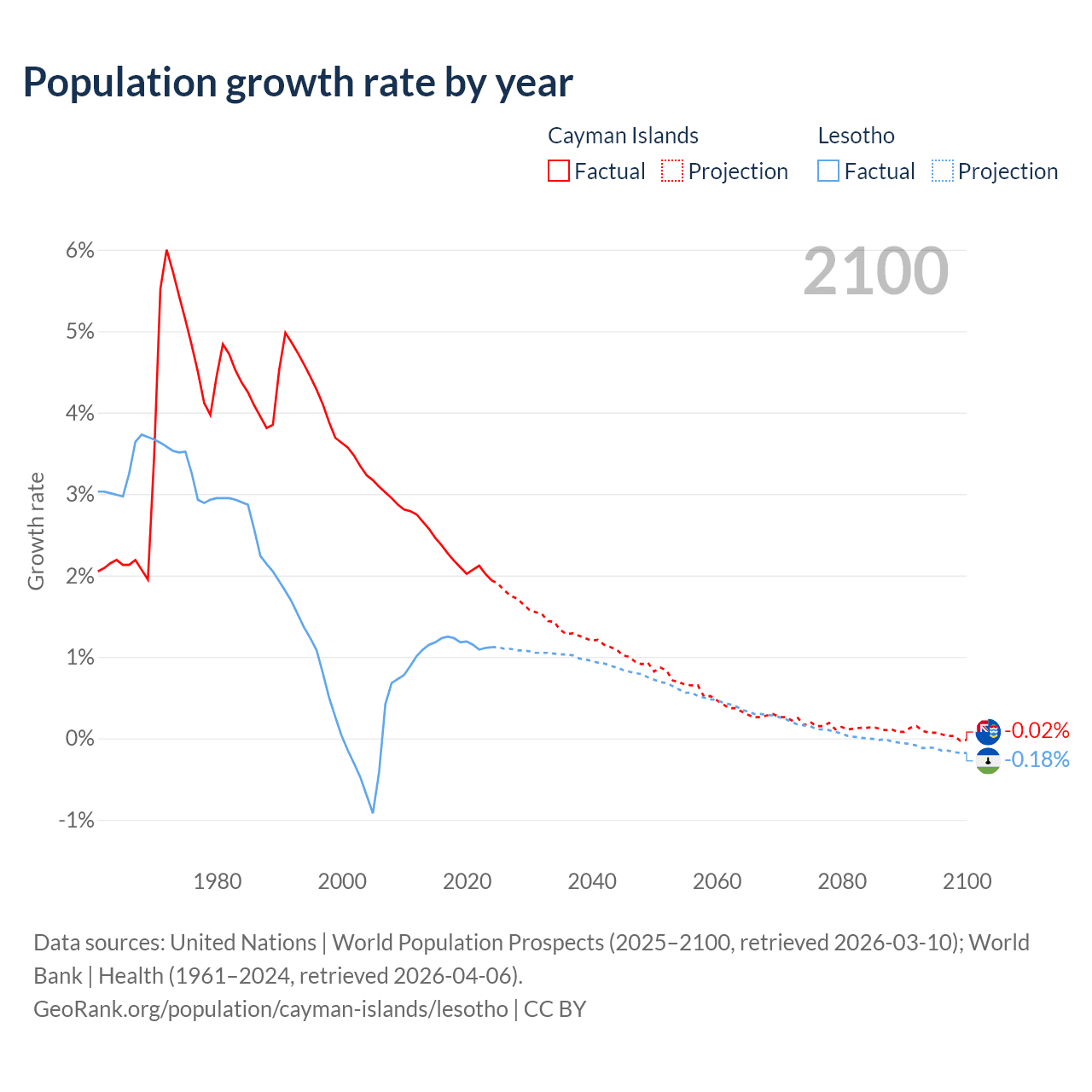 - For the last 10 years, the Cayman Islands has had an average growth rate of +2.19% per year vs +1.17% in Lesotho.