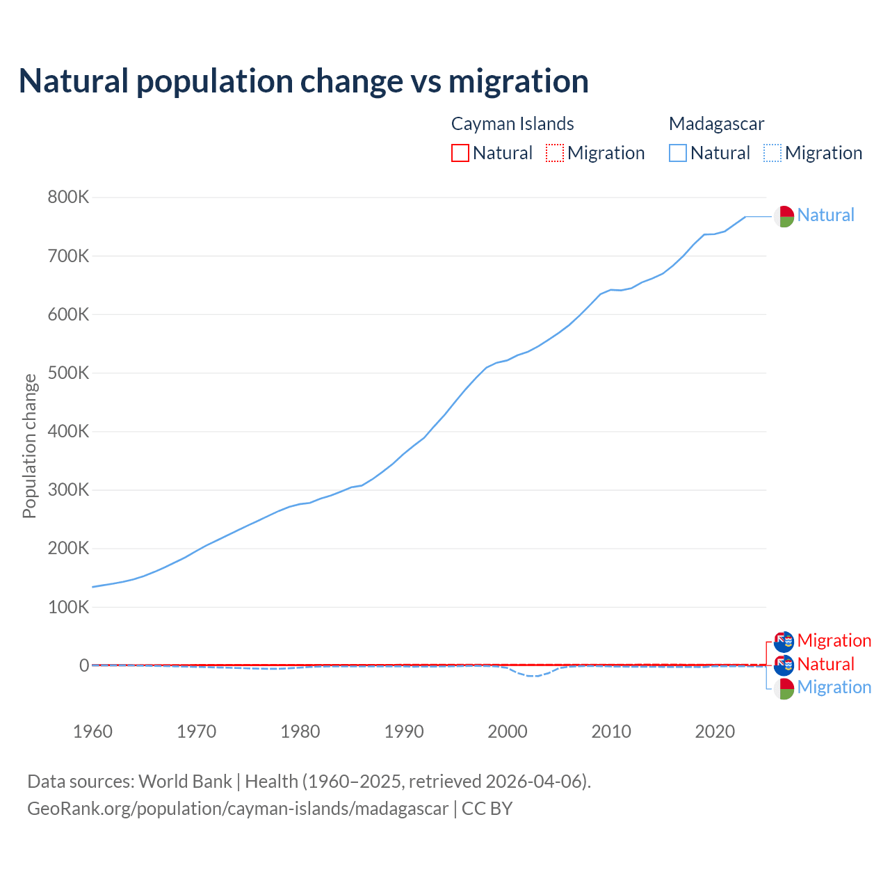 Over the last 10 years, 31.1% of the population change in the Cayman Islands is from natural causes (a gain of 4,468 people) and 68.9% is from migration (a gain of 9,879 people). In Madagascar 99.7% is from natural causes (a gain of 7,165,578 people) and 0.31% is from migration (a loss of 22,384 people).