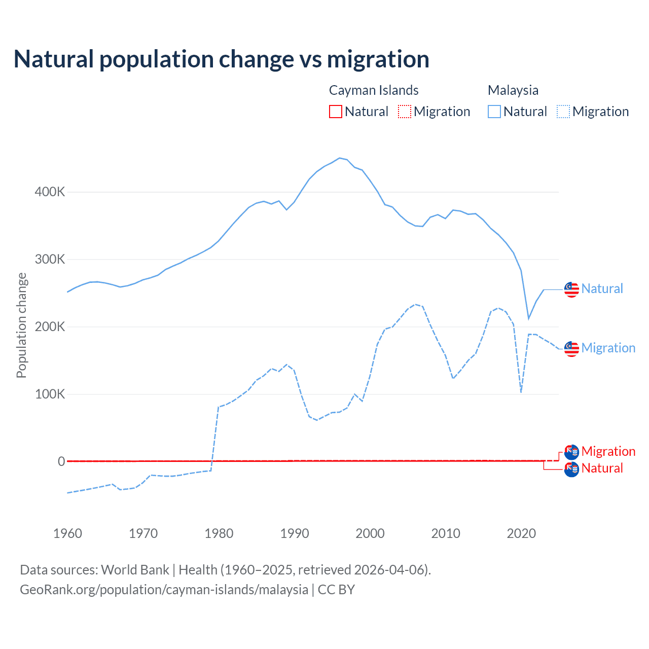 Over the last 10 years, 31.1% of the population change in the Cayman Islands is from natural causes (a gain of 4,468 people) and 68.9% is from migration (a gain of 9,879 people). In Malaysia 61.7% is from natural causes (a gain of 3,029,648 people) and 38.3% is from migration (a gain of 1,882,159 people).