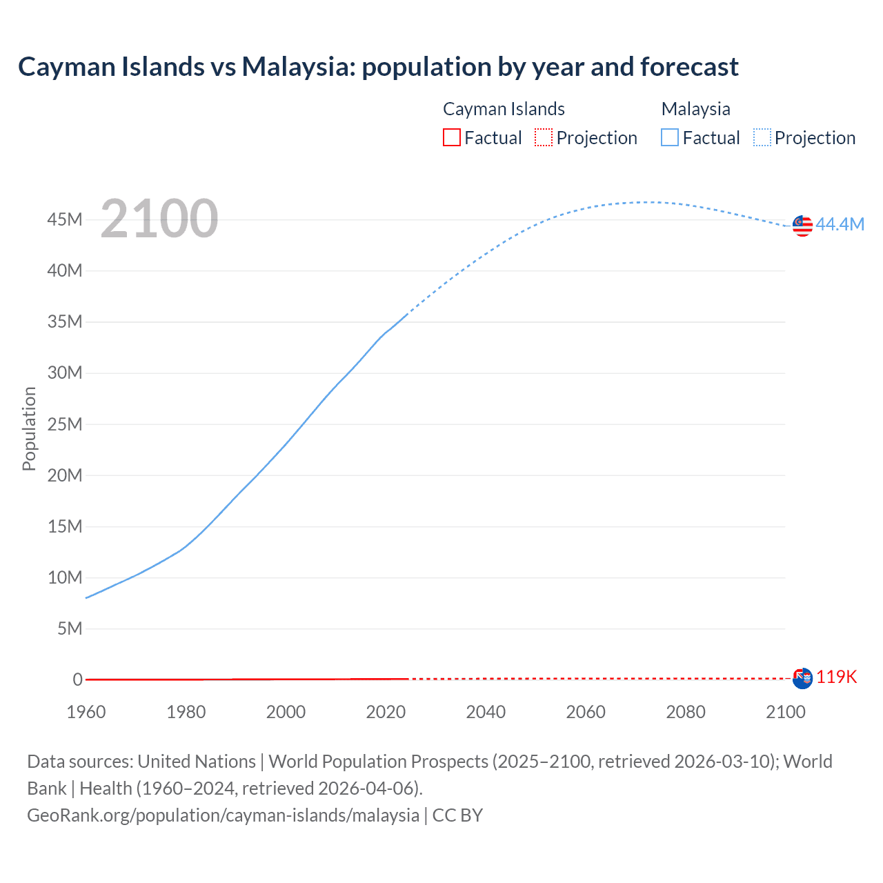 Cayman Islands vs Malaysia: population by year and forecast