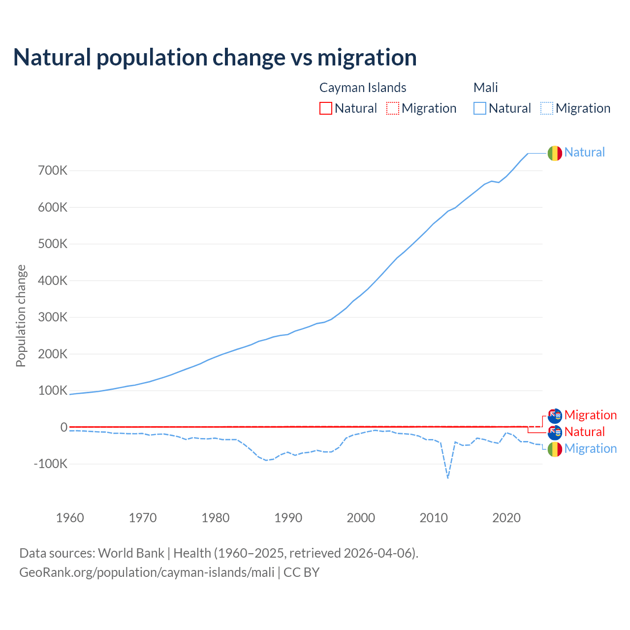 Over the last 10 years, 31.1% of the population change in the Cayman Islands is from natural causes (a gain of 4,468 people) and 68.9% is from migration (a gain of 9,879 people). In Mali 94.9% is from natural causes (a gain of 6,749,473 people) and 5.13% is from migration (a loss of 365,292 people).