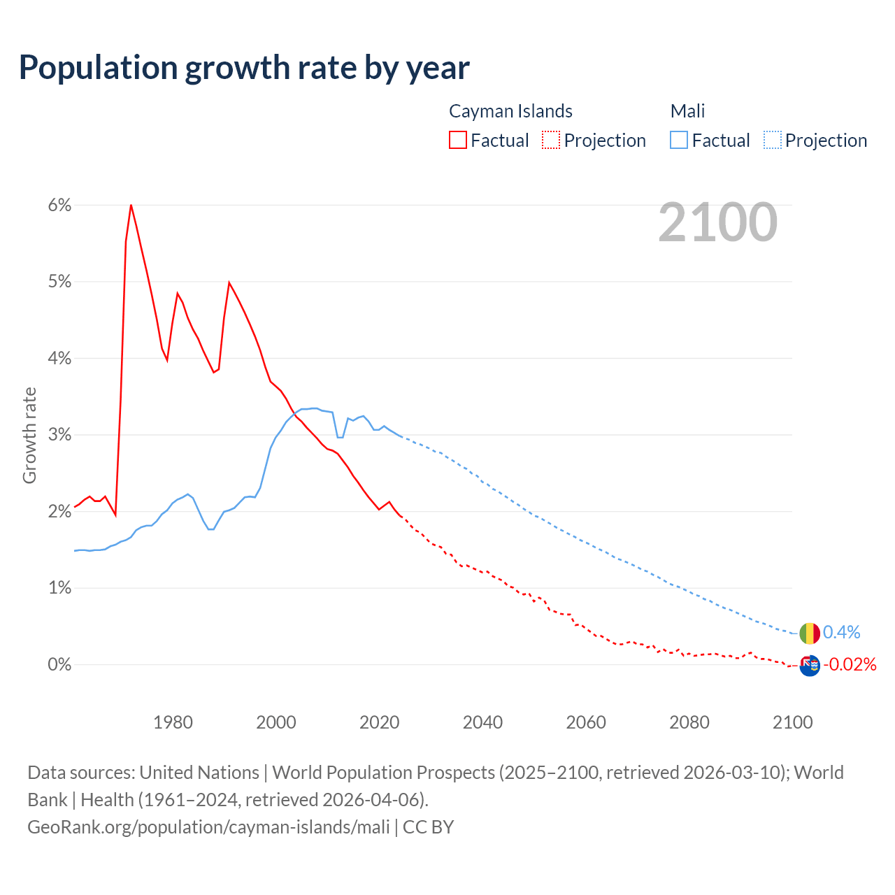 - For the last 10 years, the Cayman Islands has had an average growth rate of +2.19% per year vs +3.12% in Mali.