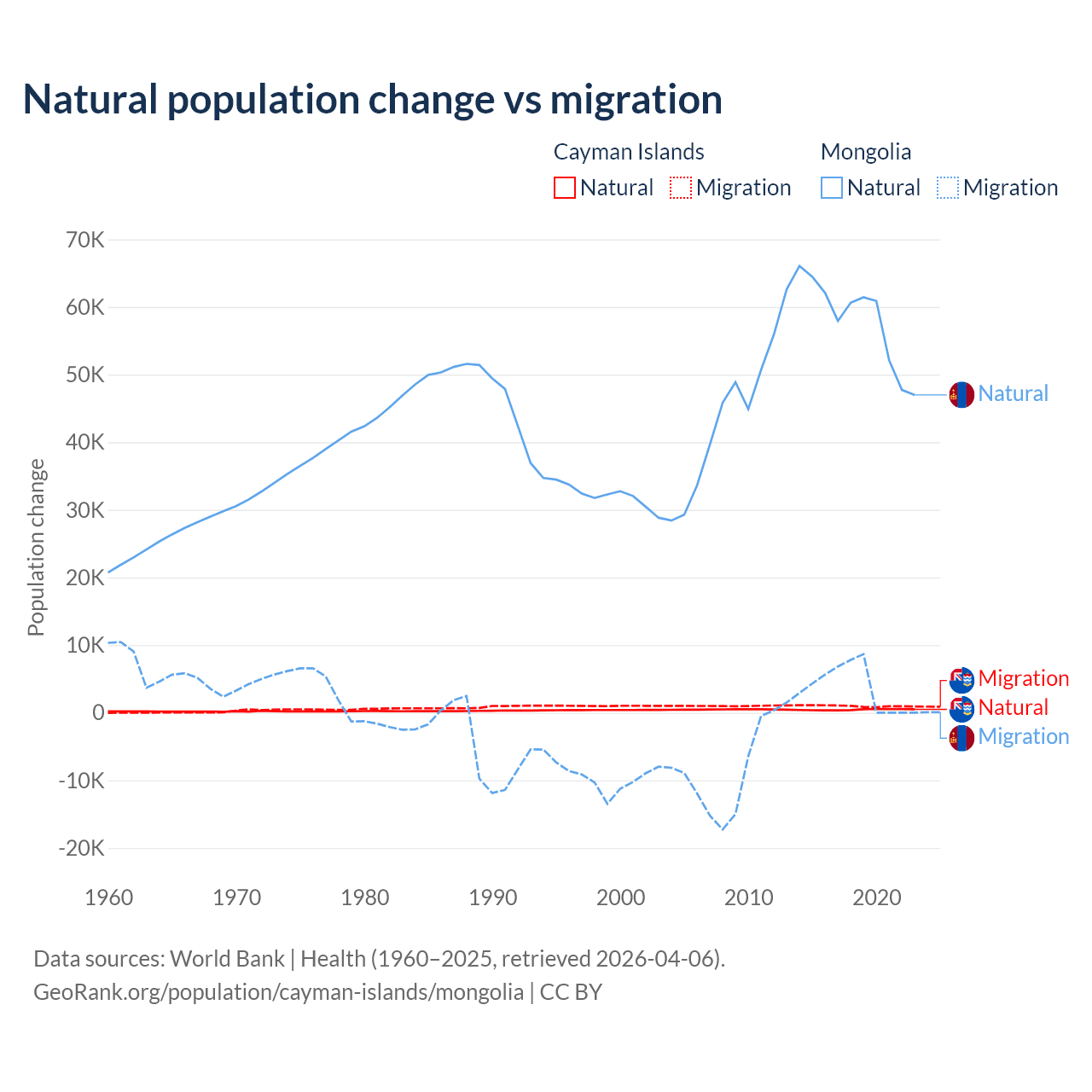 Over the last 10 years, 31.1% of the population change in the Cayman Islands is from natural causes (a gain of 4,468 people) and 68.9% is from migration (a gain of 9,879 people). In Mongolia 94.1% is from natural causes (a gain of 580,367 people) and 5.87% is from migration (a gain of 36,163 people).