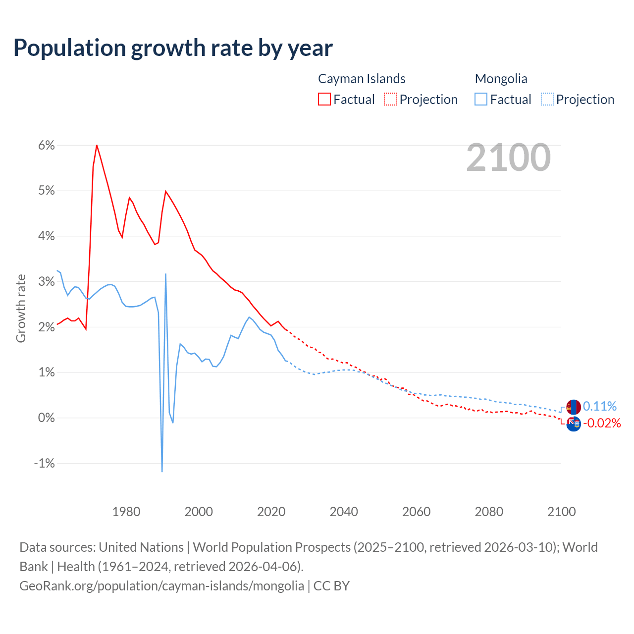 - For the last 10 years, the Cayman Islands has had an average growth rate of +2.19% per year vs +1.79% in Mongolia.