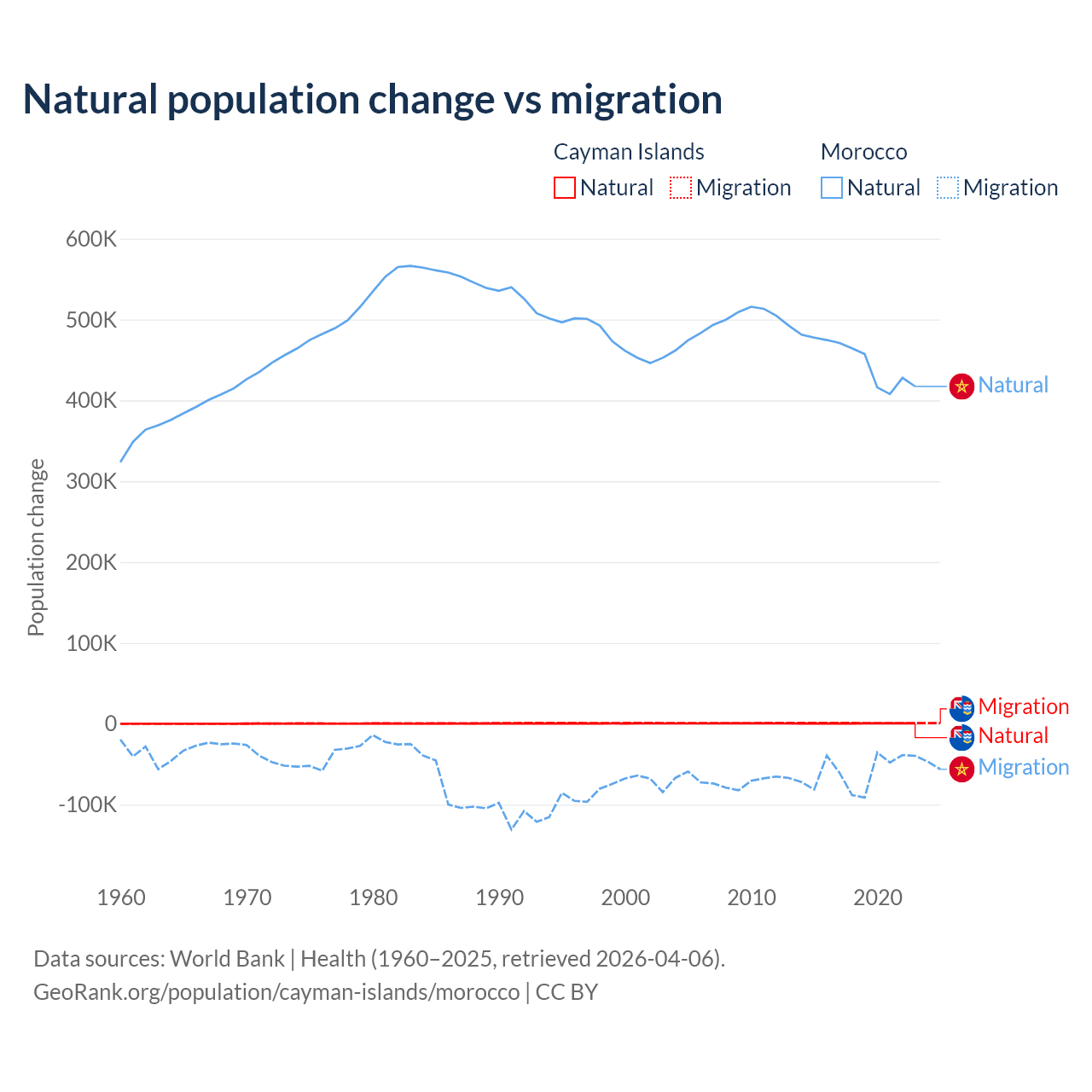 Over the last 10 years, 31.1% of the population change in the Cayman Islands is from natural causes (a gain of 4,468 people) and 68.9% is from migration (a gain of 9,879 people). In Morocco 88.3% is from natural causes (a gain of 4,495,223 people) and 11.7% is from migration (a loss of 594,083 people).