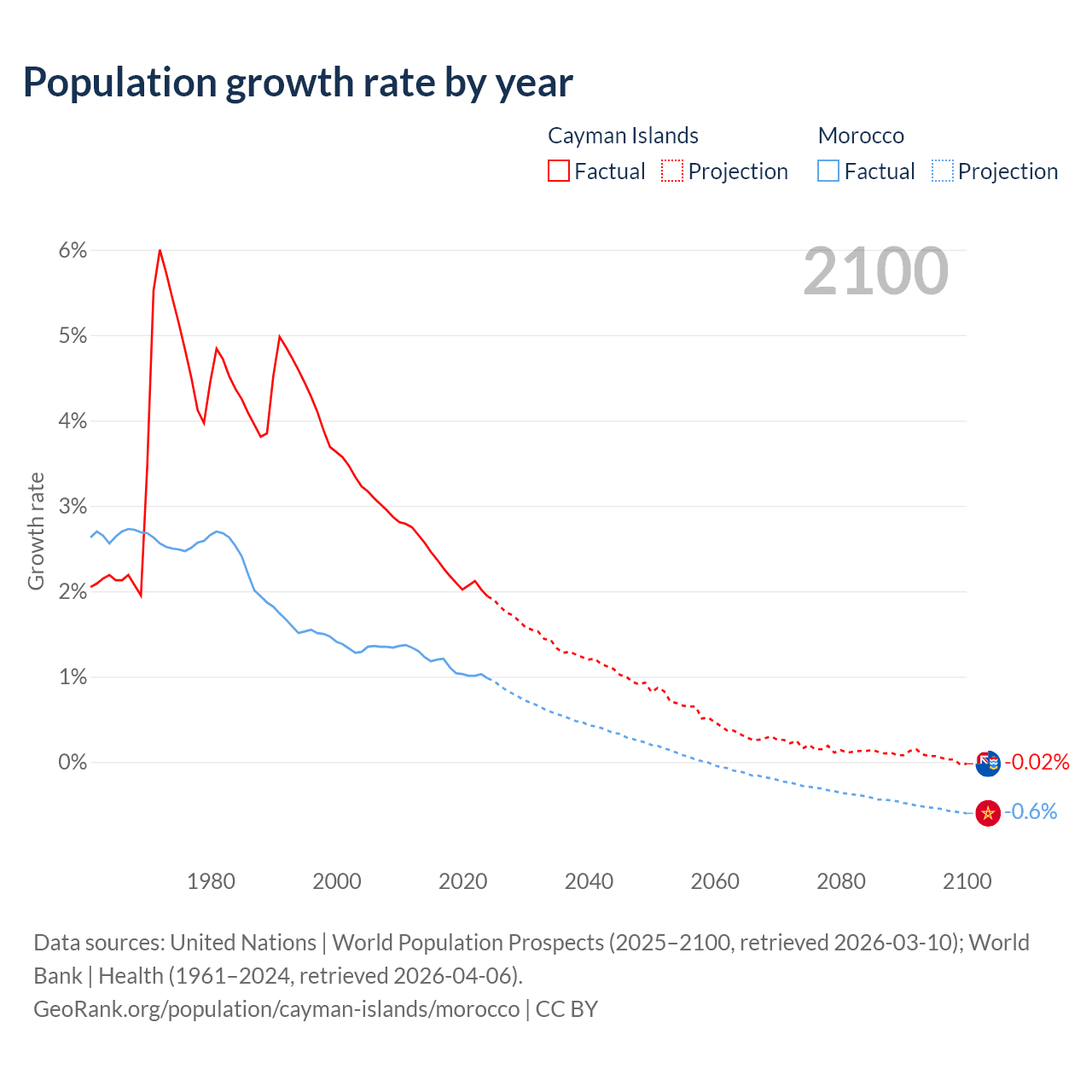 - For the last 10 years, the Cayman Islands has had an average growth rate of +2.19% per year vs +1.09% in Morocco.