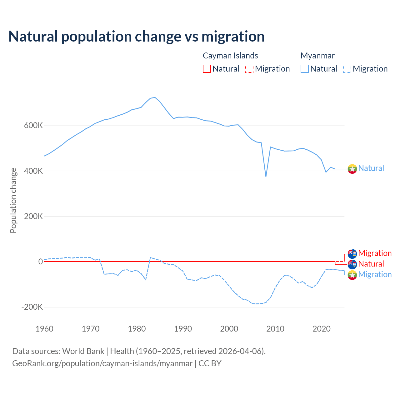 Over the last 10 years, 31.1% of the population change in the Cayman Islands is from natural causes (a gain of 4,468 people) and 68.9% is from migration (a gain of 9,879 people). In Myanmar 86% is from natural causes (a gain of 4,594,615 people) and 14% is from migration (a loss of 749,272 people).