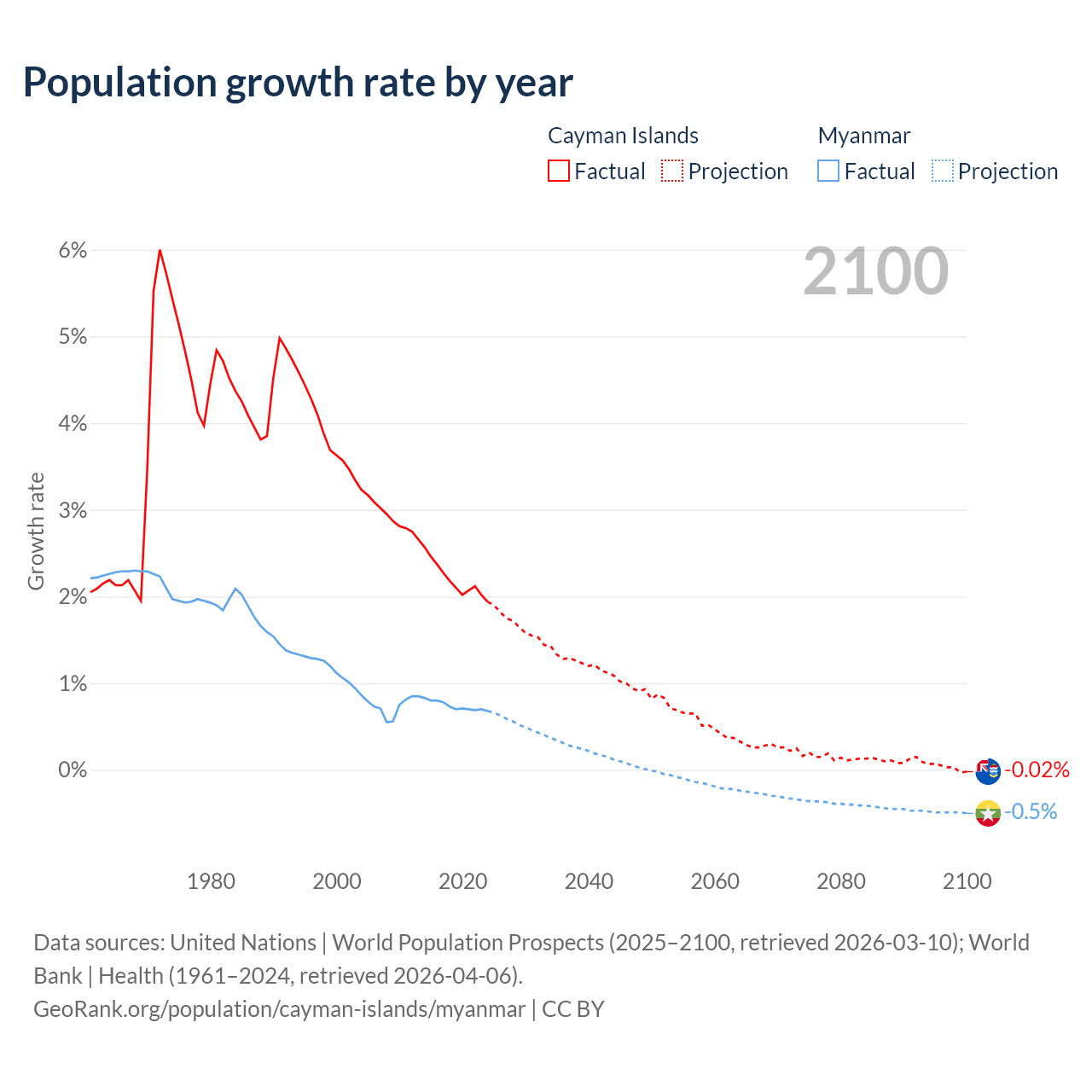 - For the last 10 years, the Cayman Islands has had an average growth rate of +2.19% per year vs +0.74% in Myanmar.