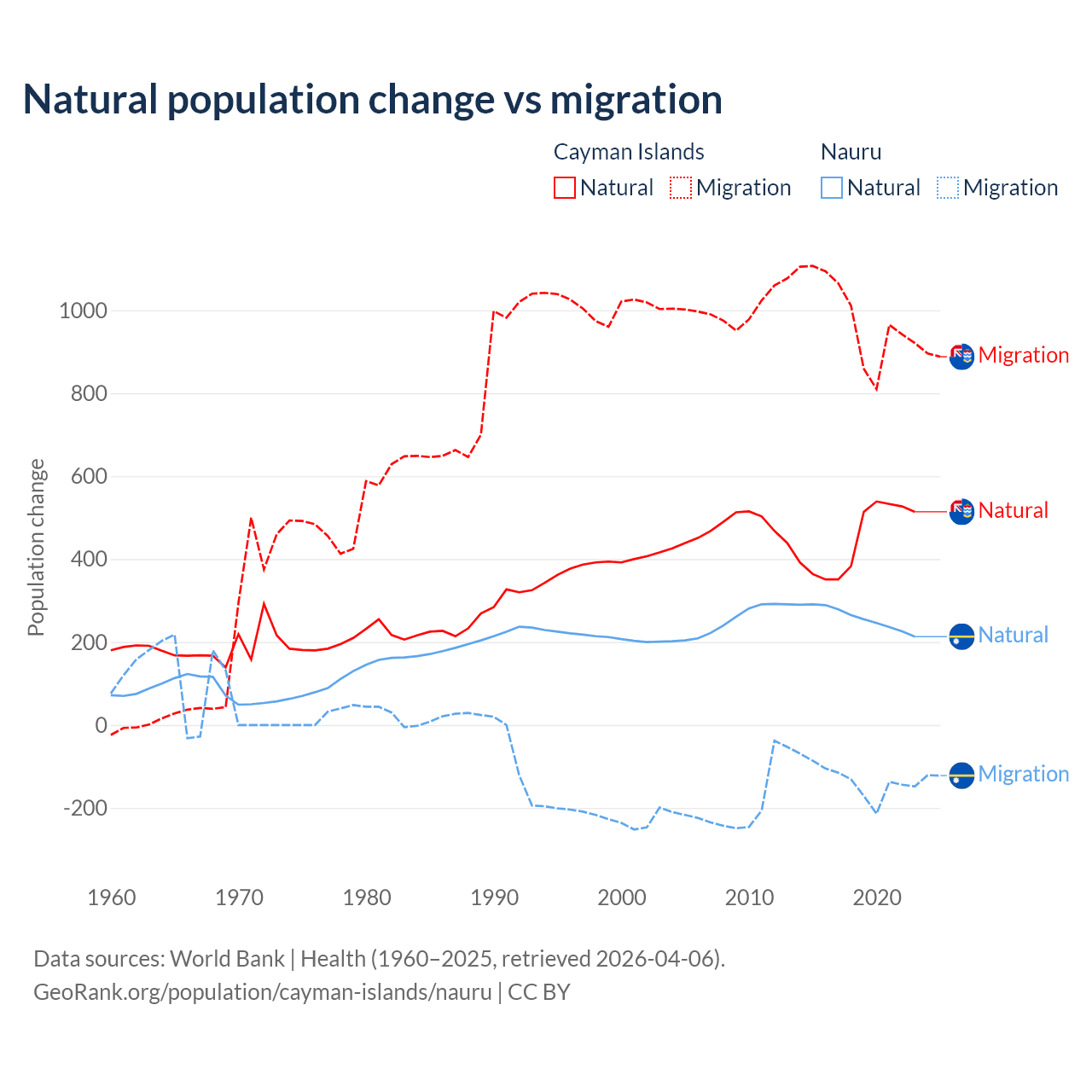 Over the last 10 years, 31.1% of the population change in the Cayman Islands is from natural causes (a gain of 4,468 people) and 68.9% is from migration (a gain of 9,879 people). In Nauru 66.2% is from natural causes (a gain of 2,590 people) and 33.8% is from migration (a loss of 1,320 people).