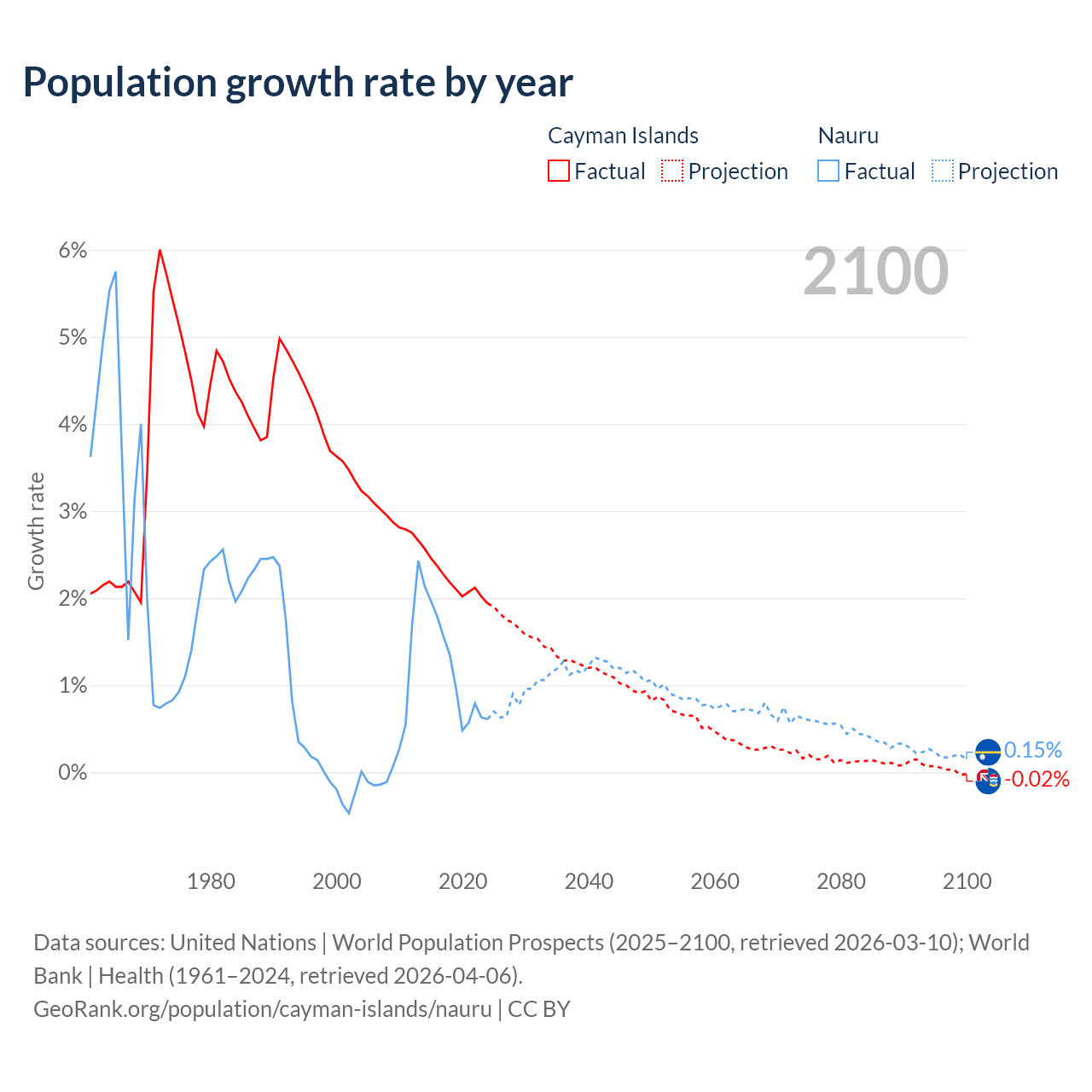 - For the last 10 years, the Cayman Islands has had an average growth rate of +2.19% per year vs +1.17% in Nauru.