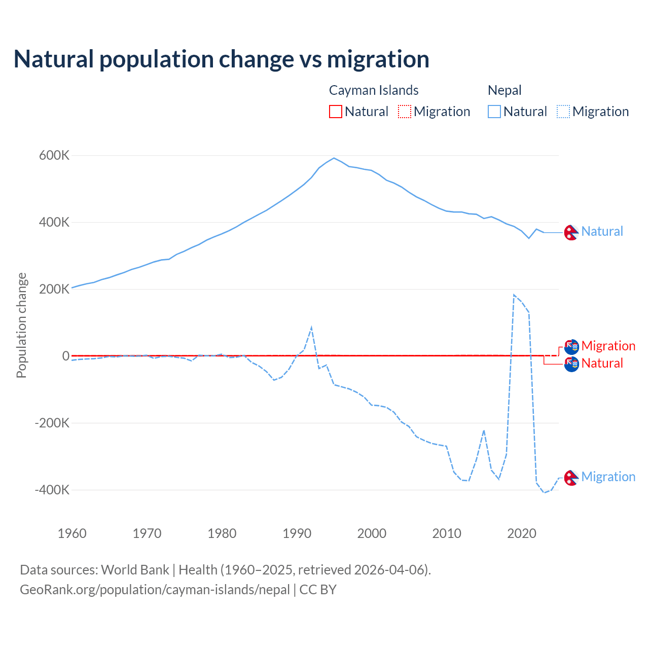 Over the last 10 years, 31.1% of the population change in the Cayman Islands is from natural causes (a gain of 4,468 people) and 68.9% is from migration (a gain of 9,879 people). In Nepal 67.9% is from natural causes (a gain of 3,909,749 people) and 32.1% is from migration (a loss of 1,851,664 people).