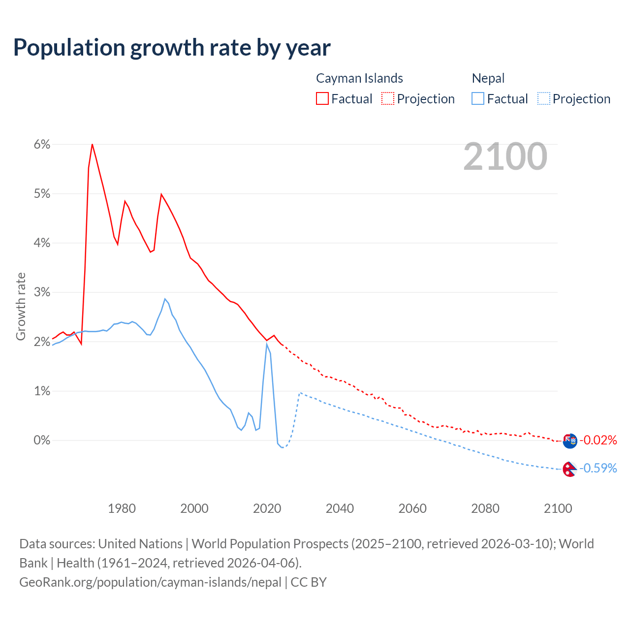 Data sources: World Bank | Health (1960–2024, retrieved 2026-04-06); United Nations | World Population Prospects (1960–2026, retrieved 2026-03-10); U.S. Census Bureau (1960–2025, retrieved 2026-02-08); Central Intelligence Agency (CIA) (2000–2019, retrieved 2026-02-20).