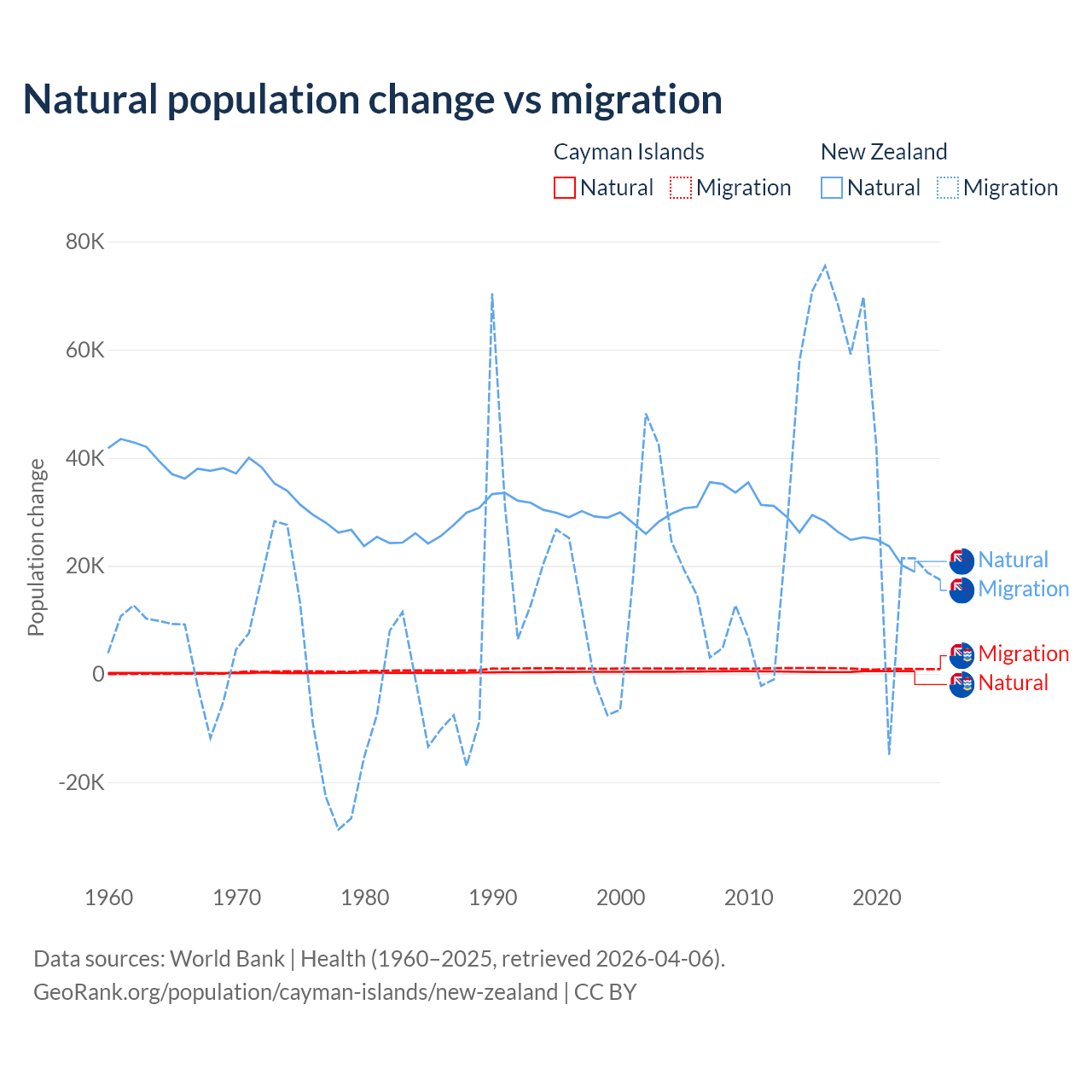 Over the last 10 years, 31.1% of the population change in the Cayman Islands is from natural causes (a gain of 4,468 people) and 68.9% is from migration (a gain of 9,879 people). In New Zealand 34.4% is from natural causes (a gain of 247,767 people) and 65.6% is from migration (a gain of 471,602 people).