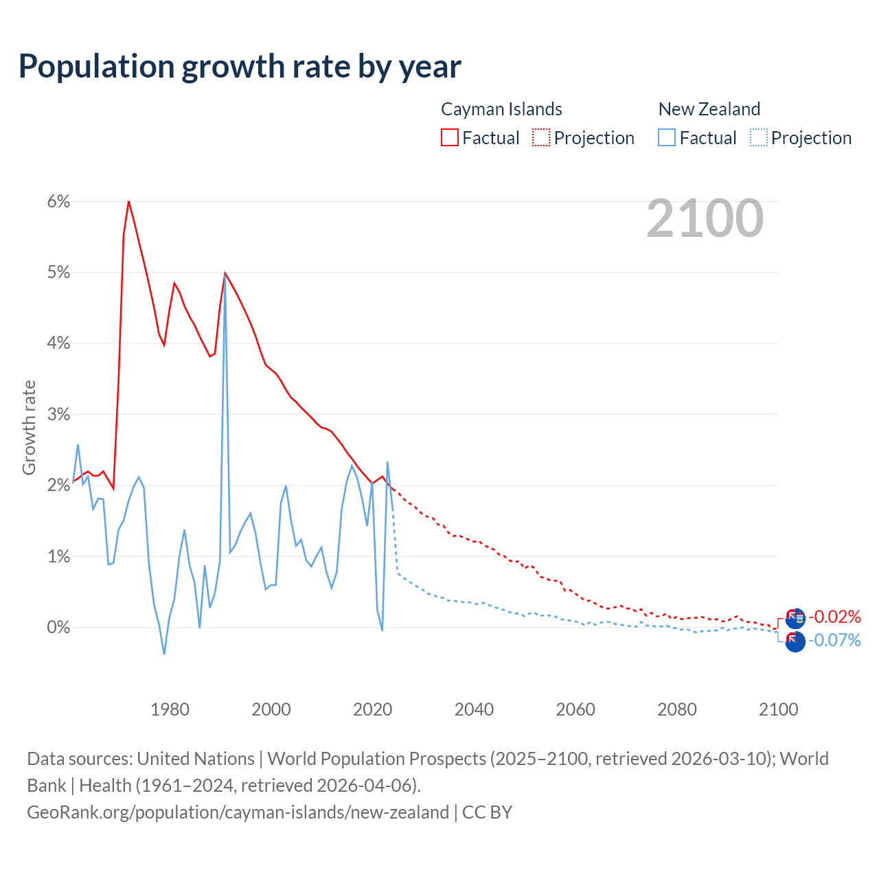 - For the last 10 years, the Cayman Islands has had an average growth rate of +2.19% per year vs +1.6% in New Zealand.