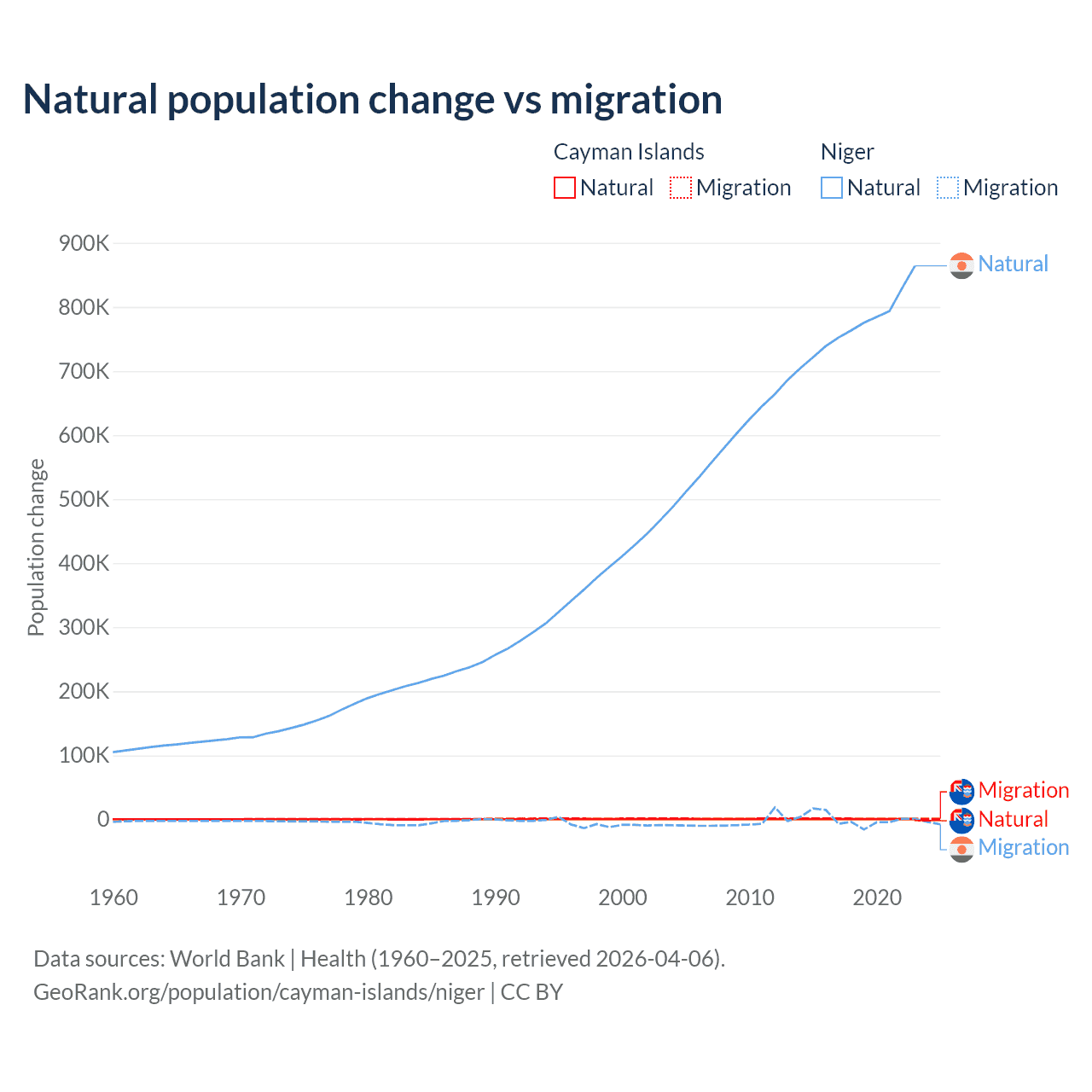 Over the last 10 years, 31.1% of the population change in the Cayman Islands is from natural causes (a gain of 4,468 people) and 68.9% is from migration (a gain of 9,879 people). In Niger 100% is from natural causes (a gain of 7,728,287 people) and 0.03% is from migration (a gain of 2,520 people).
